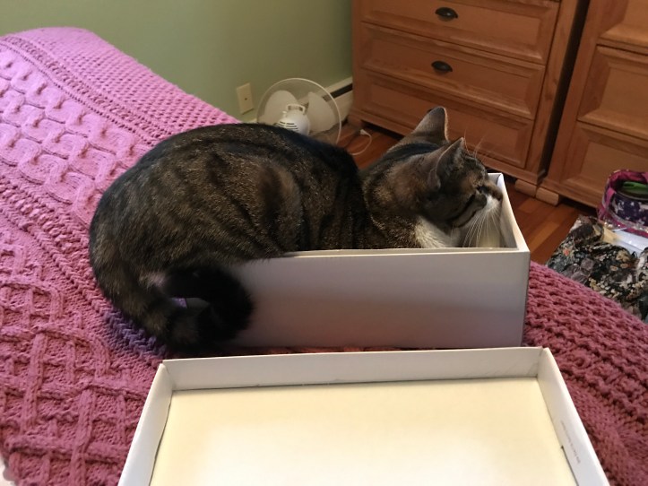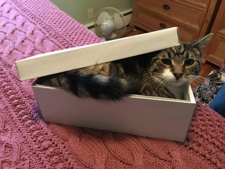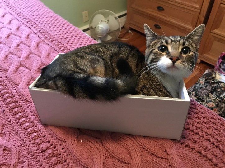 My cat: We got a cat in October, and her name is Stella. She was fostered by my mom’s best friend, and we convinced my dad to get a cat. She’s eight months old now and a spaz. She runs around the house—especially at night—and still pesters my dogs a little bit. Last week, she squeezed herself into a shoe box, seen below: