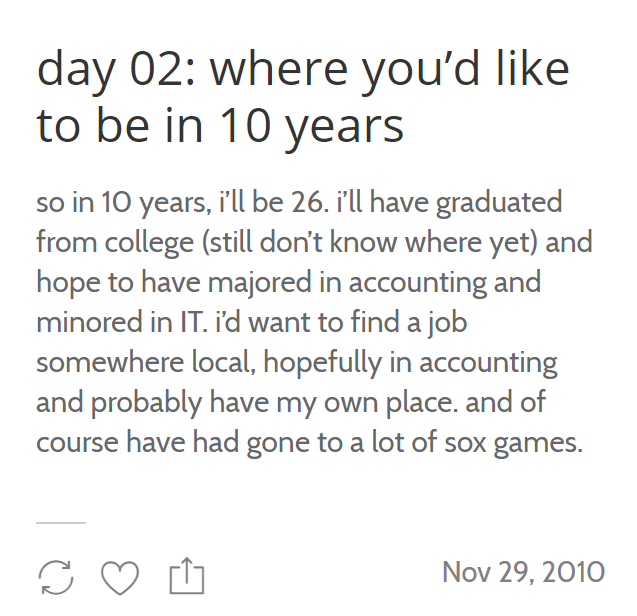 I’ll be 26 in two years. Only one part of that will most likely be correct by then: having graduated college. I took one accounting class my sophomore year of high school—in 2010—and thought I wanted to be an accountant for the rest of my life. THANKFULLY I figured out that wasn’t a good idea. Having my own place may be iffy. Not sure if/when I’m ever moving out of my parents’ house… Maybe I could afford to in a couple of years. And 2010 me would be disappointed that 2018 me has only been to four Red Sox games.