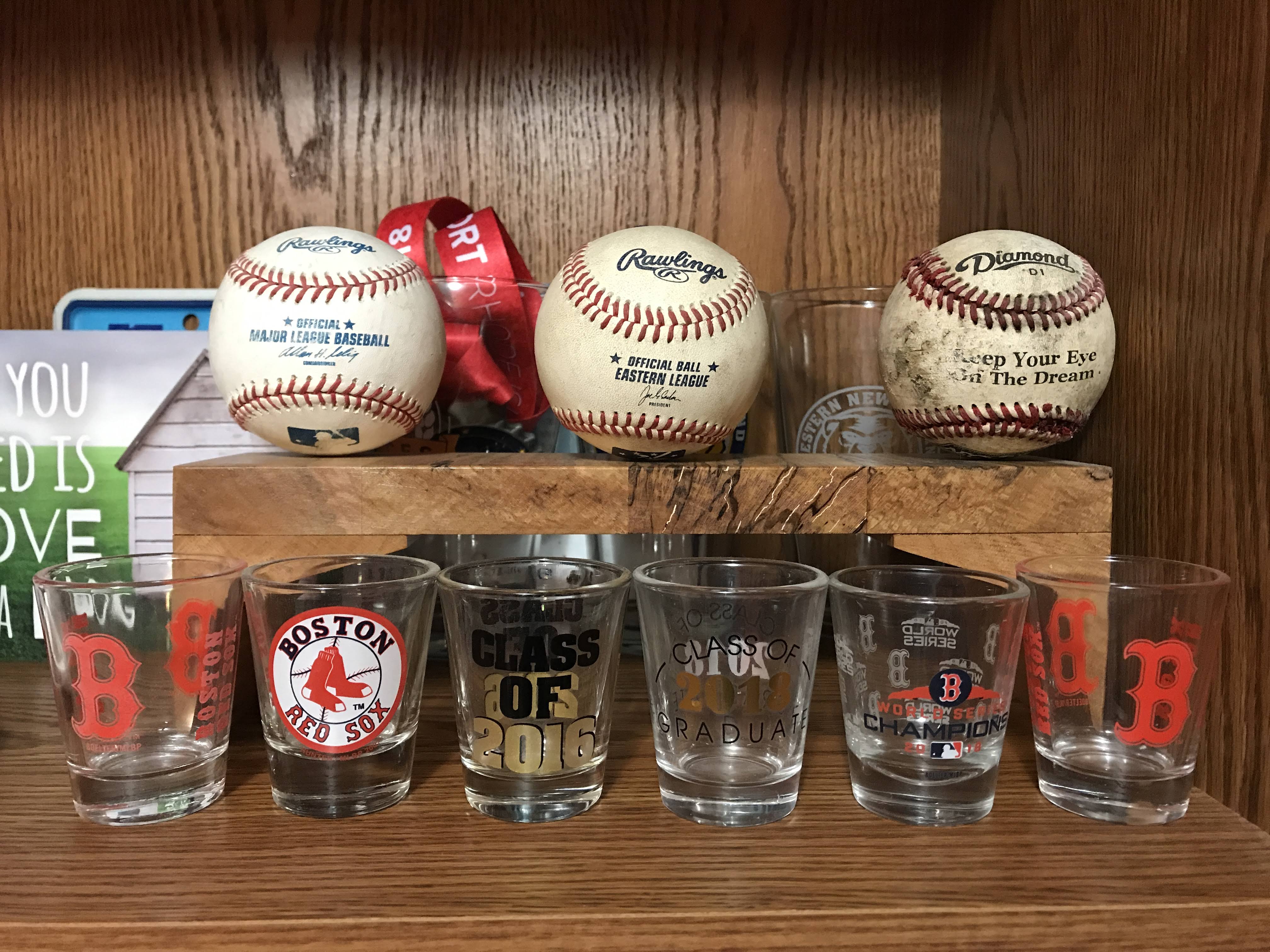 The very top shelf in the middle holds various glasses, a few signs, my baseball and shot glass collections, and my two 5k race medals are in glasses behind the stand that holds the baseballs. In the two shelves below that, the one on the left holds all of my medications and the one on the right holds thank you cards, post-its, and a few small pads of paper. The two shelves in the upper right also hold various glasses, pictures, and cards I’ve received throughout the year. The lower sections on the right both hold miscellaneous items that need homes, oh, and, my tea collection. The middle drawer—the one that pulls out for a keyboard—holds a few notebooks and important papers I need easy access to.