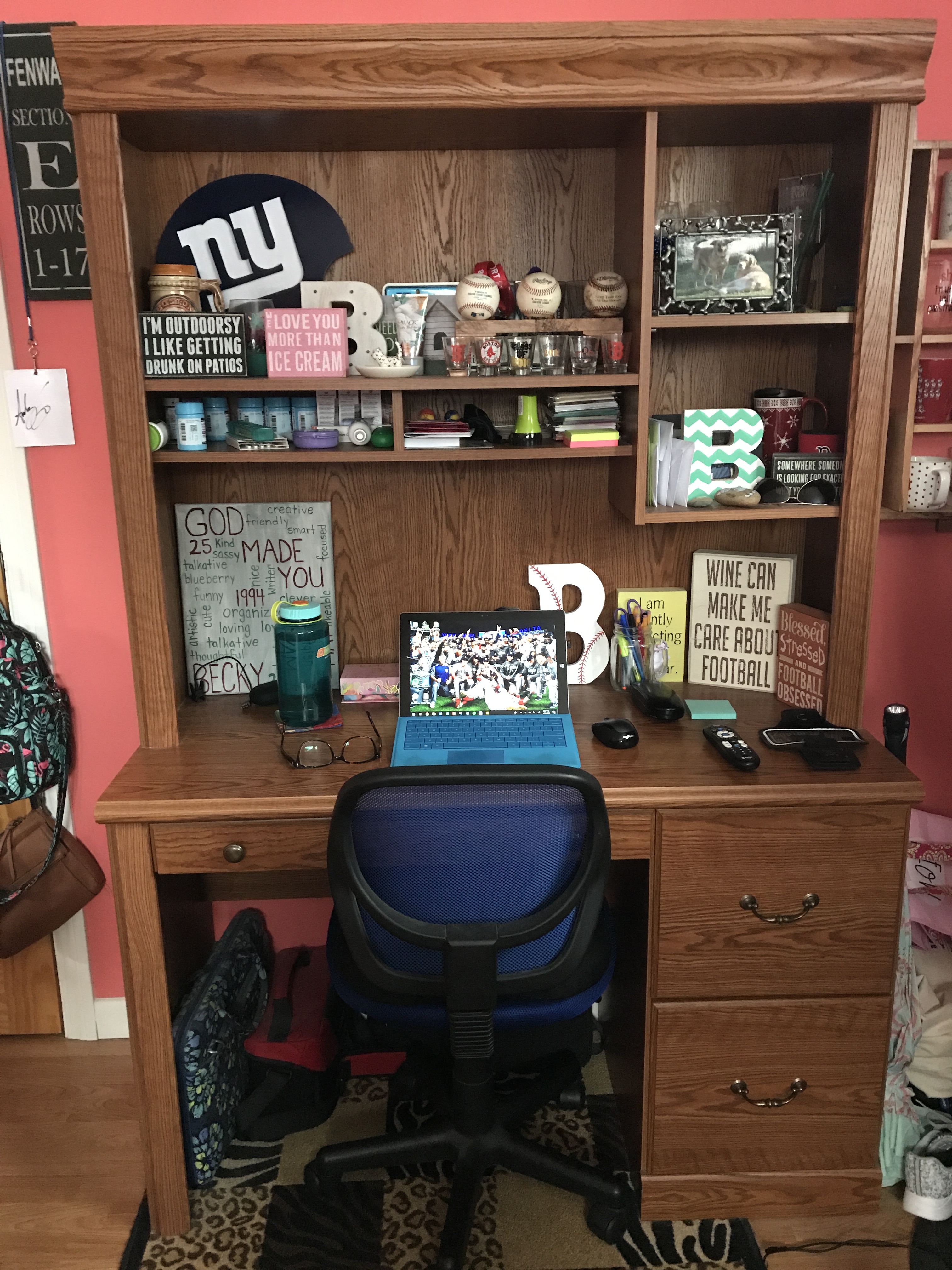 It’s nothing glamorous or too organized—I guess perks of living in my childhood bedroom—but this is where I sit and write. While I was on break after Christmas, I did a purge and cleaned out some of the stuff on the shelves and in the two sections on the lower right. (The top door opens to the right, and the bottom pulls out as a drawer.)