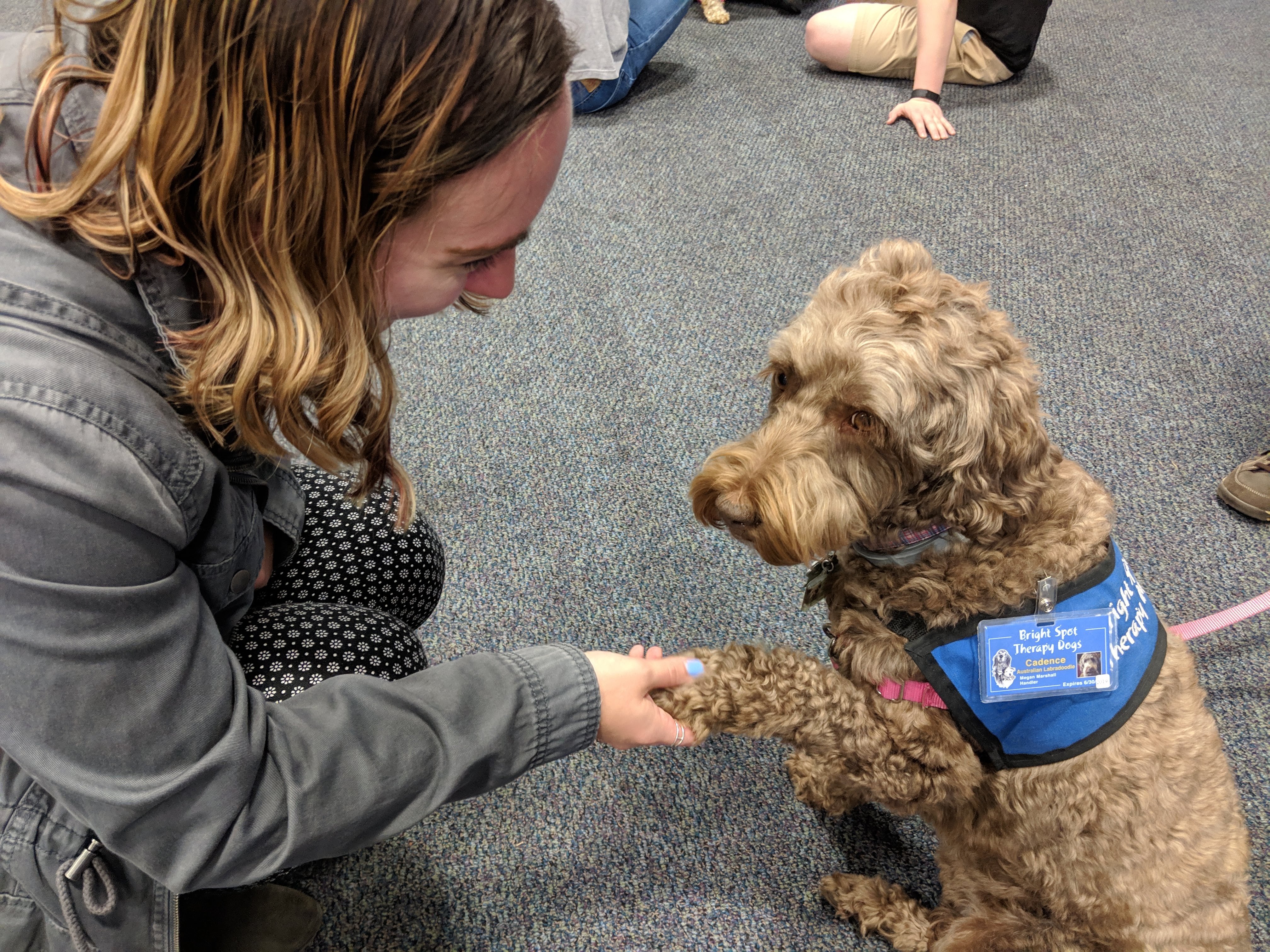 Every semester, an organization on campus brings therapy dogs for finals, and of course I go and see them. The dogs are always so calm—I guess it’s part of the job—and I’d like to go to different colleges and other places and bring my pup for some pets. As you can see in the picture below, they each have their own little vest and name tag.