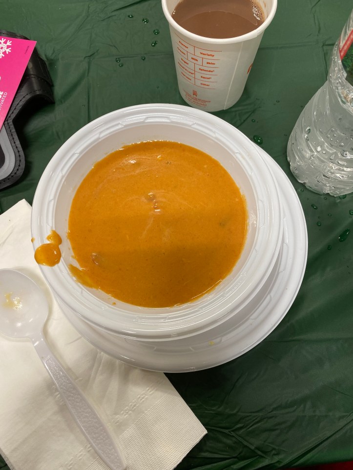 Post-race included a soup bar! The soup on the left is cheeseburger chowder, and the soup on the right is tomato basil. (There was also chicken noodle.) Both were really good.