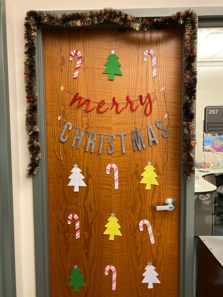 I wanted to decorate my office for Christmas on November 1 but held back. We had snow on December 2 and 3, so I didn’t get into my office to decorate until December 4; I was a little upset I lost a few days of being festive. I keep my white Christmas lights up year round, so that was one less thing I had to put up.