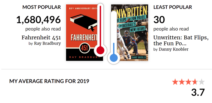 I did horribly with my reading goals for 2019. I know I can make excuses and they would be legitimate, for the most part… but I think I mostly got complacent. I really hope 2020 is better for me in this area. No, I just need to decide to make 2020 better where reading is concerned.