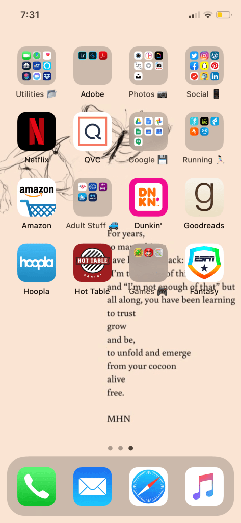 You would be very unhappy with my phone. It is not at all organized like yours. Some of my menu pages aren’t even full like, I have pages filled with only half a screen of apps lol. I just throw things around. 😂