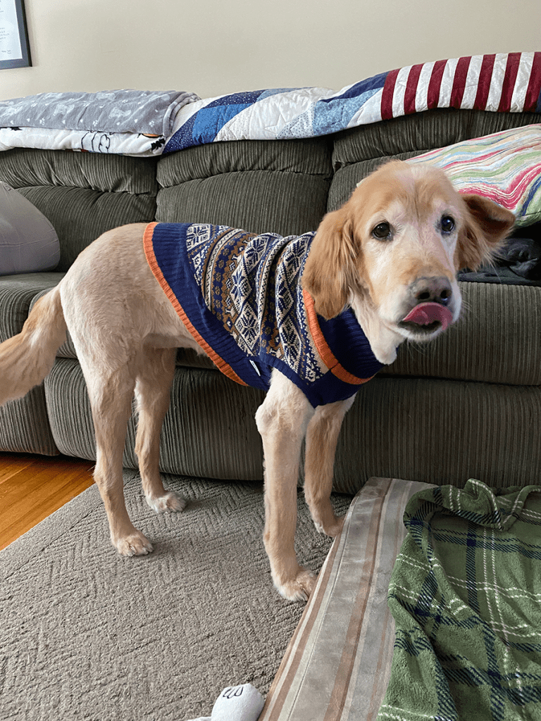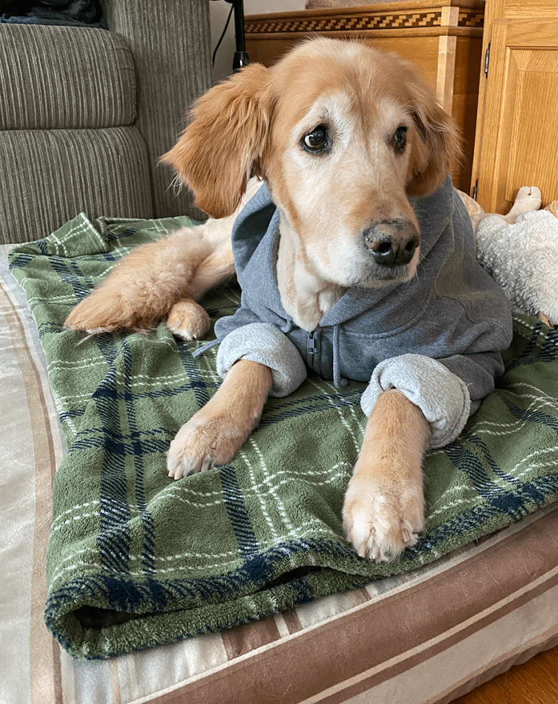 My dog Sadie Mae went to the groomers on Friday, and she came back a bit shorter than we wanted… She got her summer cut in February. So we’re trying our best to keep her warm until her fur grows back. That includes keeping an extra blanket on her bed and dressing her up in sweatshirts and sweaters.