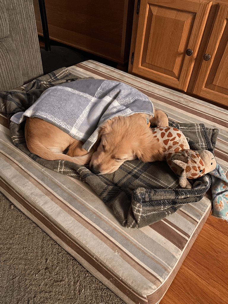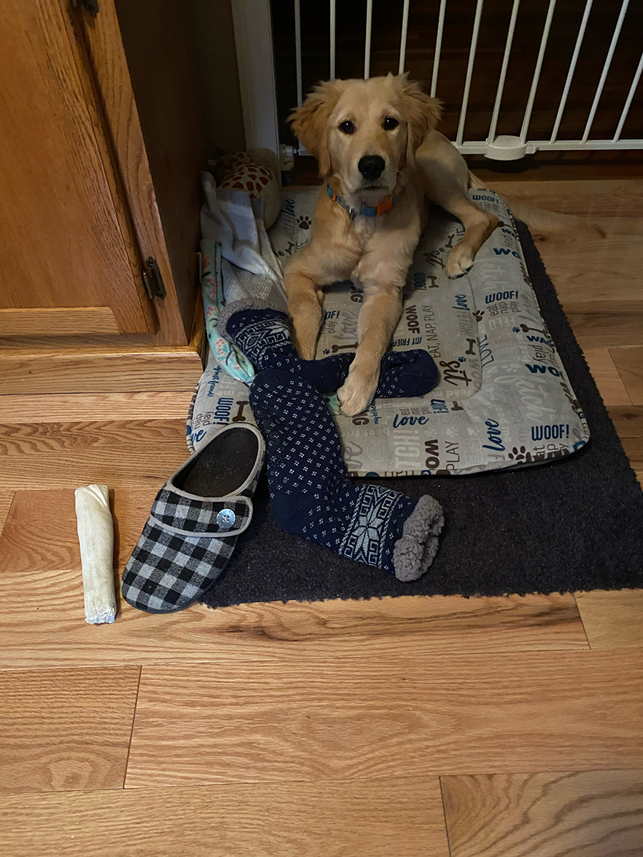 And, of course, we can’t have a monthly recap without Lucy pictures. She’s definitely been keeping my parents busy. One of her quirks is that she’ll drag shoes, sneakers, slippers, and even dish towels onto her bed. She doesn’t chew on them or anything, just lays with them. Weirdo.