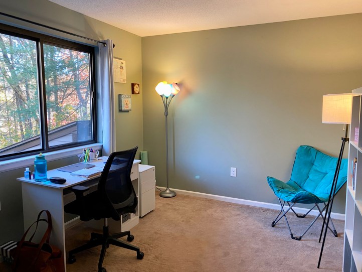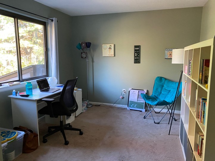 As for my home office (aka the second bedroom without doors), I tackled it myself. It was in fairly good shape, but there were rogue nails left in the wall and a few holes, too. One of my weird talents is being able to putty, sand, and paint holes in drywall that I put to use when I re-did my bedroom at home over last winter.