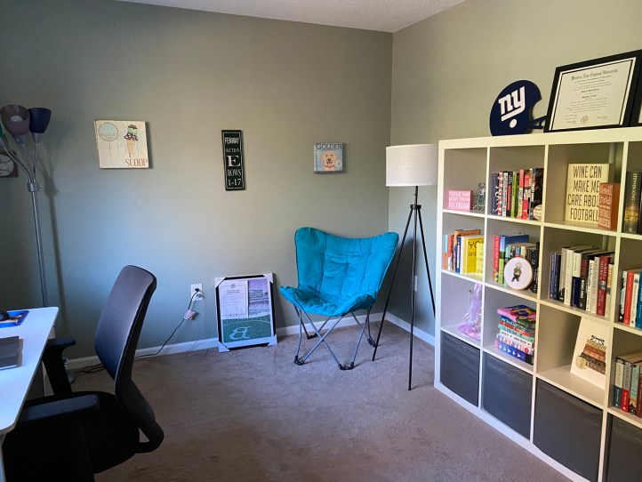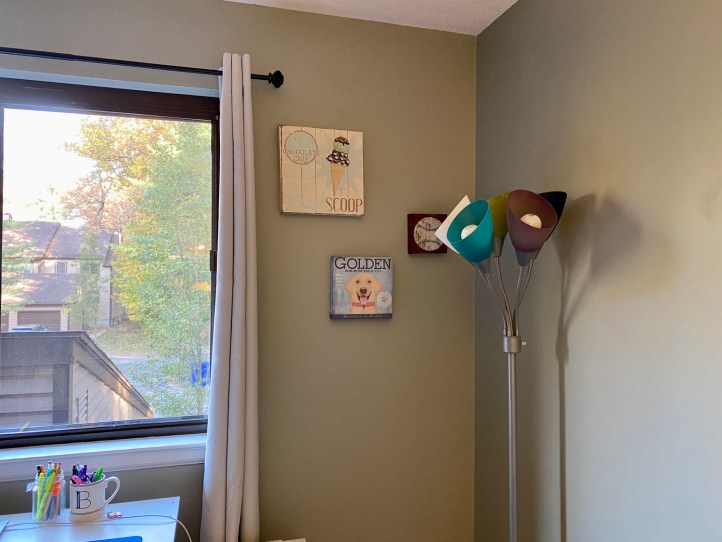 I was waiting to see what I was going to do with my office, but since I work from home twice a week now—Wednesdays and Fridays—I figured I should make it look nice in there. The black tri-pod style lamp is from Walmart and the 5-headed lamp is from my college days. Since there’s no overhead lighting, I have to rely on the lamps, especially now that it gets darker earlier when I’m working.