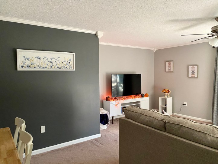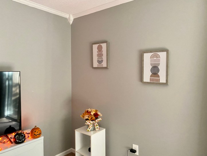 Back on my four day weekend in the end of October, my mom and I went to Home Sense and TJ Maxx to find pieces to hang up in my living room. The other weekend, my parents came over to help me hang them up.