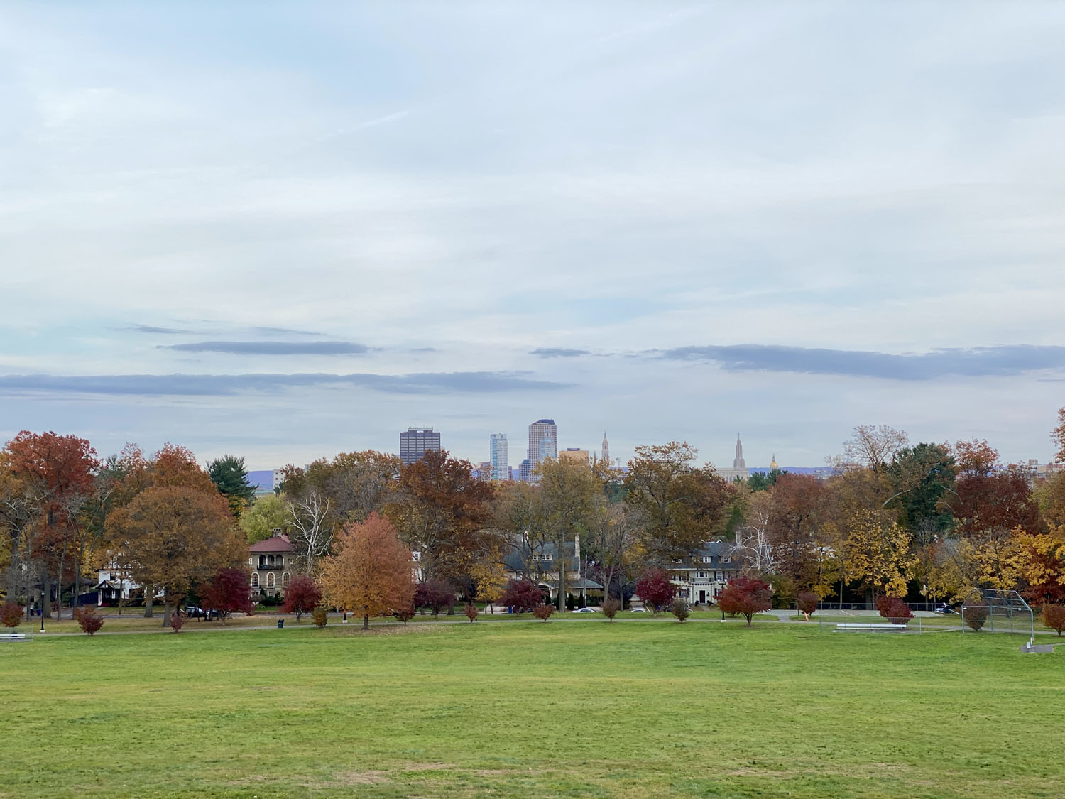 We walked through some of the smaller gardens, too, and we saw a bunch of dogs out for walks as well as people out with their families, some runners, and a few people taking pictures. Before we left, we went to the Sunrise Overlook where you can see the Hartford skyline. I zoomed in a bit in the photo below but you can see the high rise buildings as well as the gold dome of the state capital building peeking up over the trees.