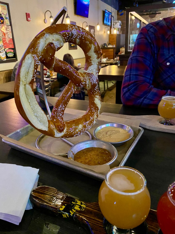 Our final stop was Blue Back Square and West Hartford Center. Both are right next to each other and offer a variety of restaurants and shops. We decided to go to World of Beer for dinner, mostly because they had a giant pretzel on the menu. Josh and I both got flights; mine was Firefly Hollow Lust, Evil Genuis Just Vibin’, Hoax Raspberry and Toasted Marshmallow, and Back Each Double Scoop. I think for the first time ever I didn’t really like one of the beers. The Evil Genuis Just Vibin’ smelled and tasted a bit like cough syrup. I only drank half of the glass. My favorite of the four was the Hoax Raspberry and Toasted Marshmallow—the redish one in the photo.