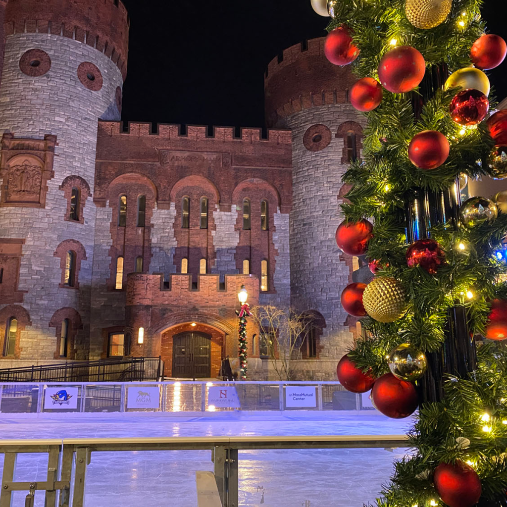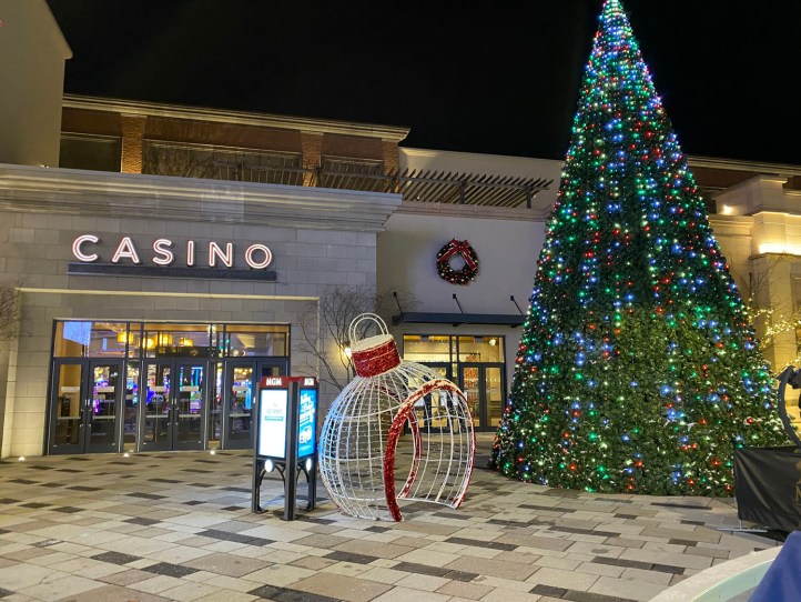 The plaza was fully decorated for Christmas. The castle-like building in the background of the first and third photos is the State Armory that was built in the late 1800s and was damaged during the June 2011 tornado that went through Western MA. It was turned into an event space and comedy club as part of the casino.
