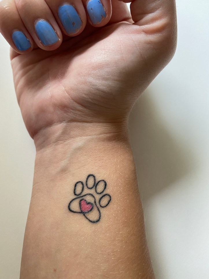 Since our tattoos were small, it didn’t take more than 15 minutes for each of us. This is a picture of mine, and my mom got the same paw print—her heart is red—and Sadie Mae’s name. I got the pink heart because Sadie always had a pink collar.