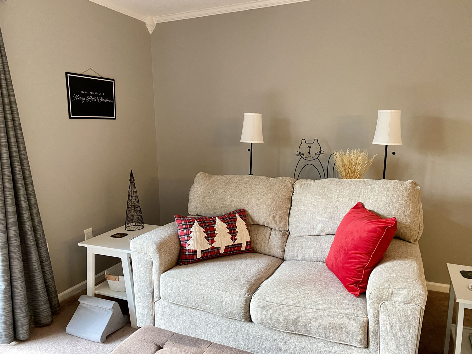And my couches were finally delivered. We ordered them in June but there was a back-log on furniture due to COVID, so I lived in the condo for a month without couches; I used an air mattress and butterfly chair instead for living room seating until my couches came.