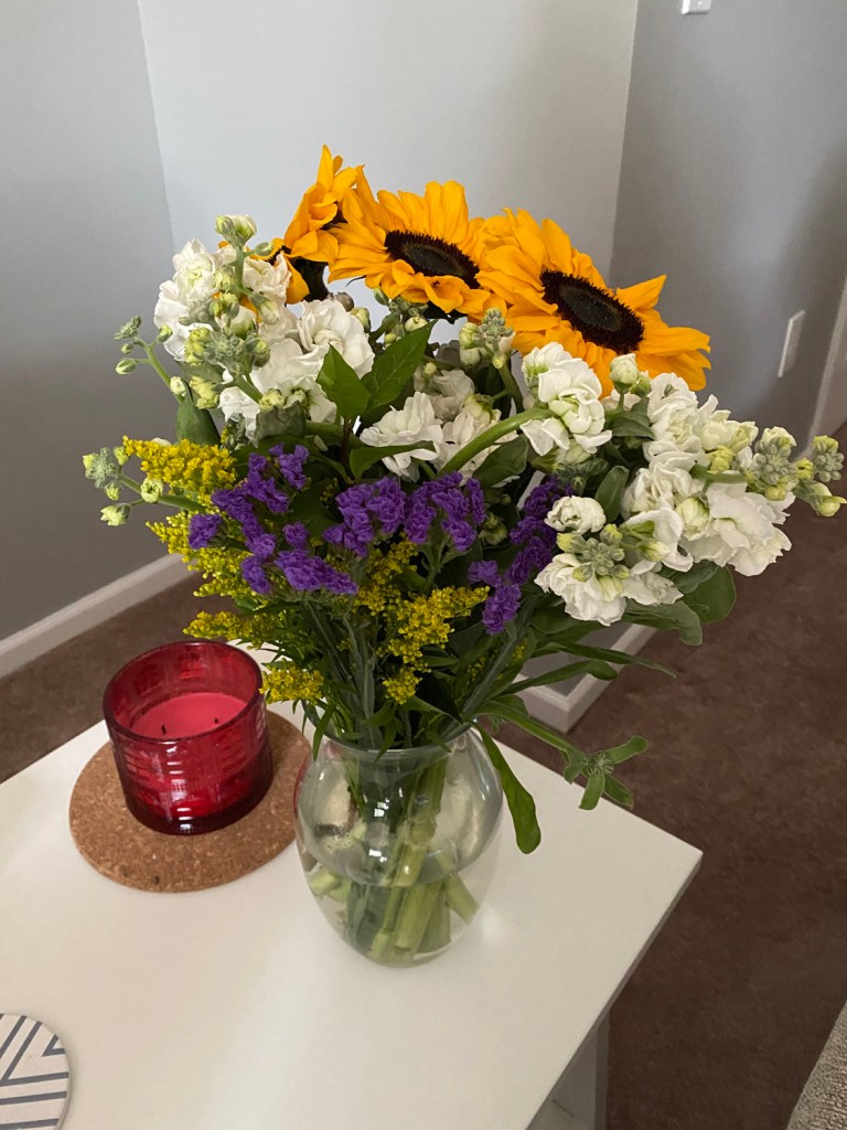 My final stop was the grocery store, and one of my favorite things now is to buy myself flowers. I stick with the bouquets of flowers because I don’t think I could keep any other kind of plant alive for too long. I put the vase on one of the end tables in the living room.
