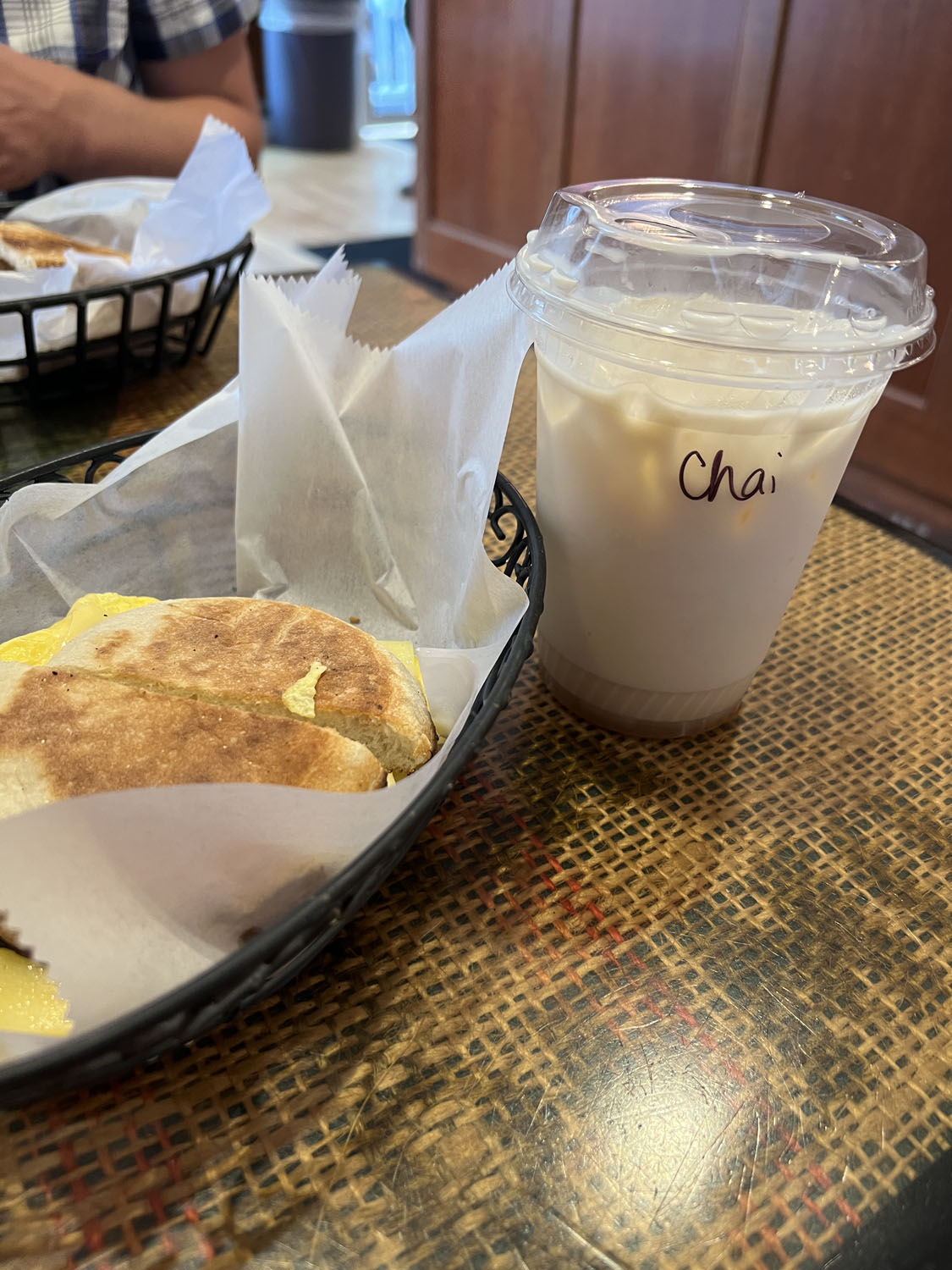 Since it wasn’t too busy, we decided to eat inside. I got an iced chai and egg and cheddar on an English Muffin and Josh got an iced coffee and a breakfast sandwich. It was super cute inside and a great breakfast option for us.