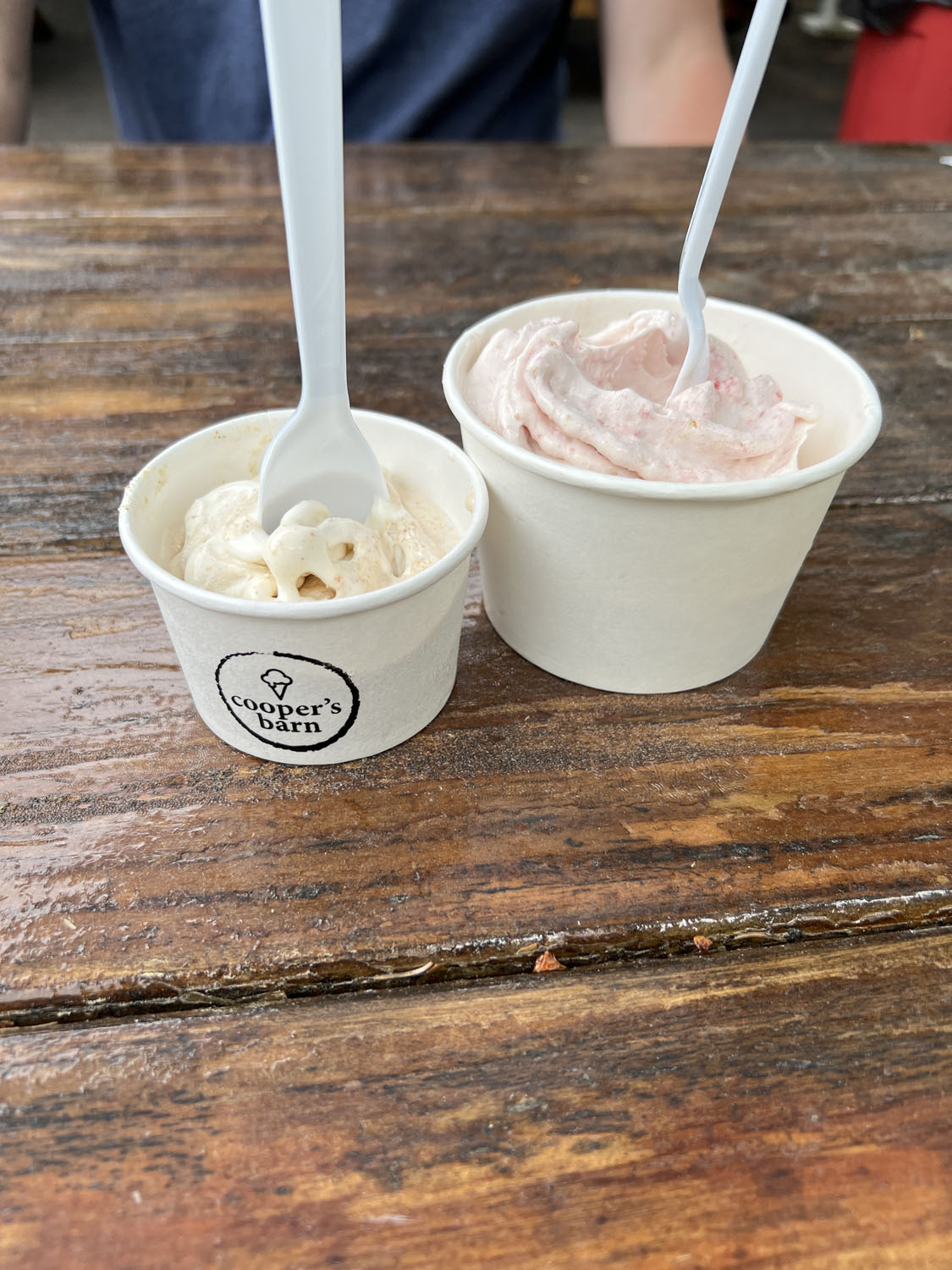 Our final stop for the day was at Cooper’s Barn for ice cream, of course. It was their first day open for the season and surprisingly they weren’t busy. It was pretty cool that you could pick your own custom ice cream flavor; you’d start with a base of either vanilla or chocolate and then pick a few things to mix in it. I got the smallest size possible of Teddy Bear, which was a vanilla base with graham cracker, shortbread, and cinnamon, and Josh got Strawberry Shortcake, which was a vanilla base with strawberries and shortbread.