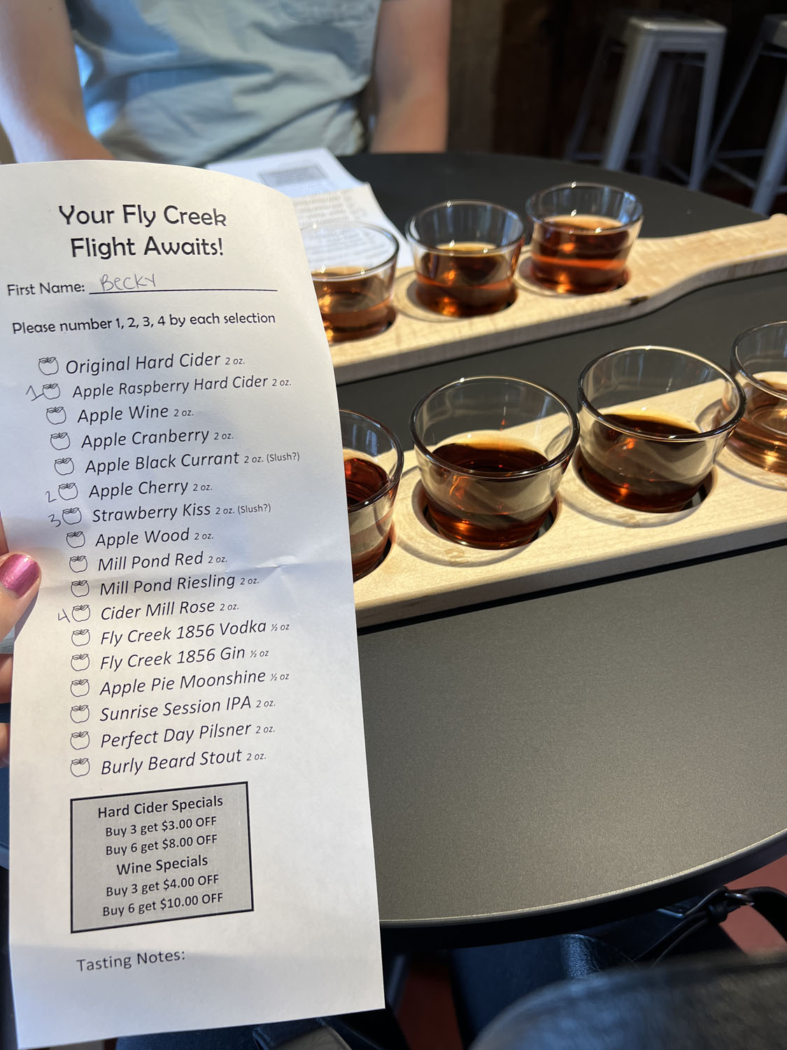 Upstairs in the building is where their apple press is—they weren’t pressing since I think it’s something they do in the fall—but we did find the tasting room. We had wine flights before noon, and that’s the best kind of wine flight. We both got a bottle of their hard cider, and I got a drinking glass and Josh got a shot glass.