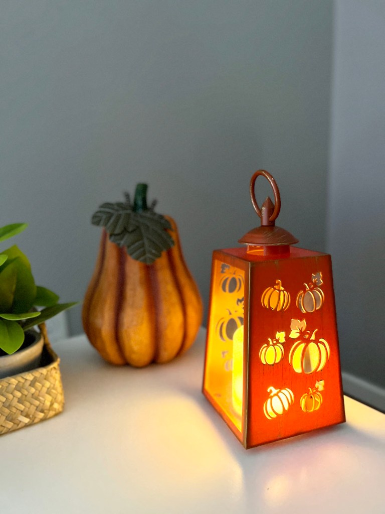The lantern with the light-up candle is something my mom ordered from QVC (it’s part of a set of three), and the pumpkin behind it is from the seasonal closet.