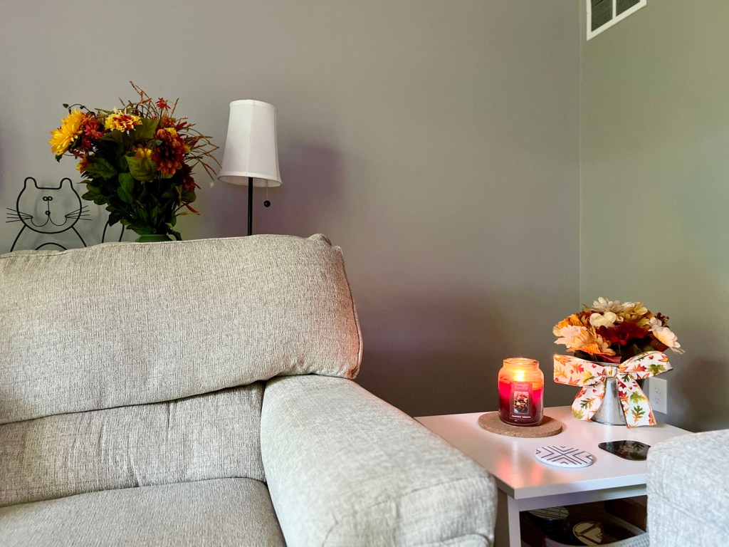 The fake flowers and vase were a gift from my grandparents after I moved in last year. I like how it looks, but since it’s so tall I have to put it on the sofa table behind my loveseat. I made the fake flowers in the metal bucket last fall, and I got all of the materials from the Dollar Store. I think it cost me $12 total when you could buy that for $20+. The candle is from my mom. I have a basket on that side table’s shelf below that holds my other seasonal candles since I like to swap them out.