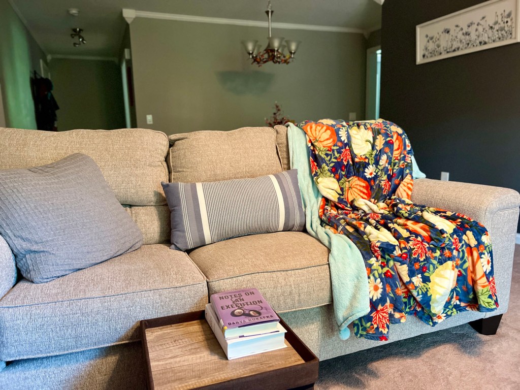 The pumpkin blanket is something my mom ordered from QVC. (The teal one underneath it is from Walmart; I kept it out since it sort of went with the fall blanket colors.)