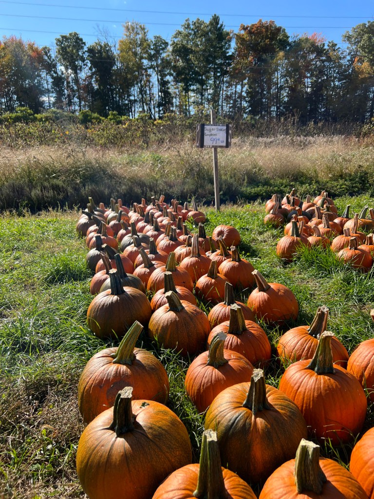 Back up front, they had pumpkins available for purchase, and I tried to find the smallest one since it was 99 cents per pound. I have no use for a big pumpkin, but the little ones were cute. I think we ended up with about five pounds of apples (I always forget how much a pound of apples is) and I bought my little pumpkin. I wiped it off when we got back, and the pumpkin’s new home is on my TV stand.