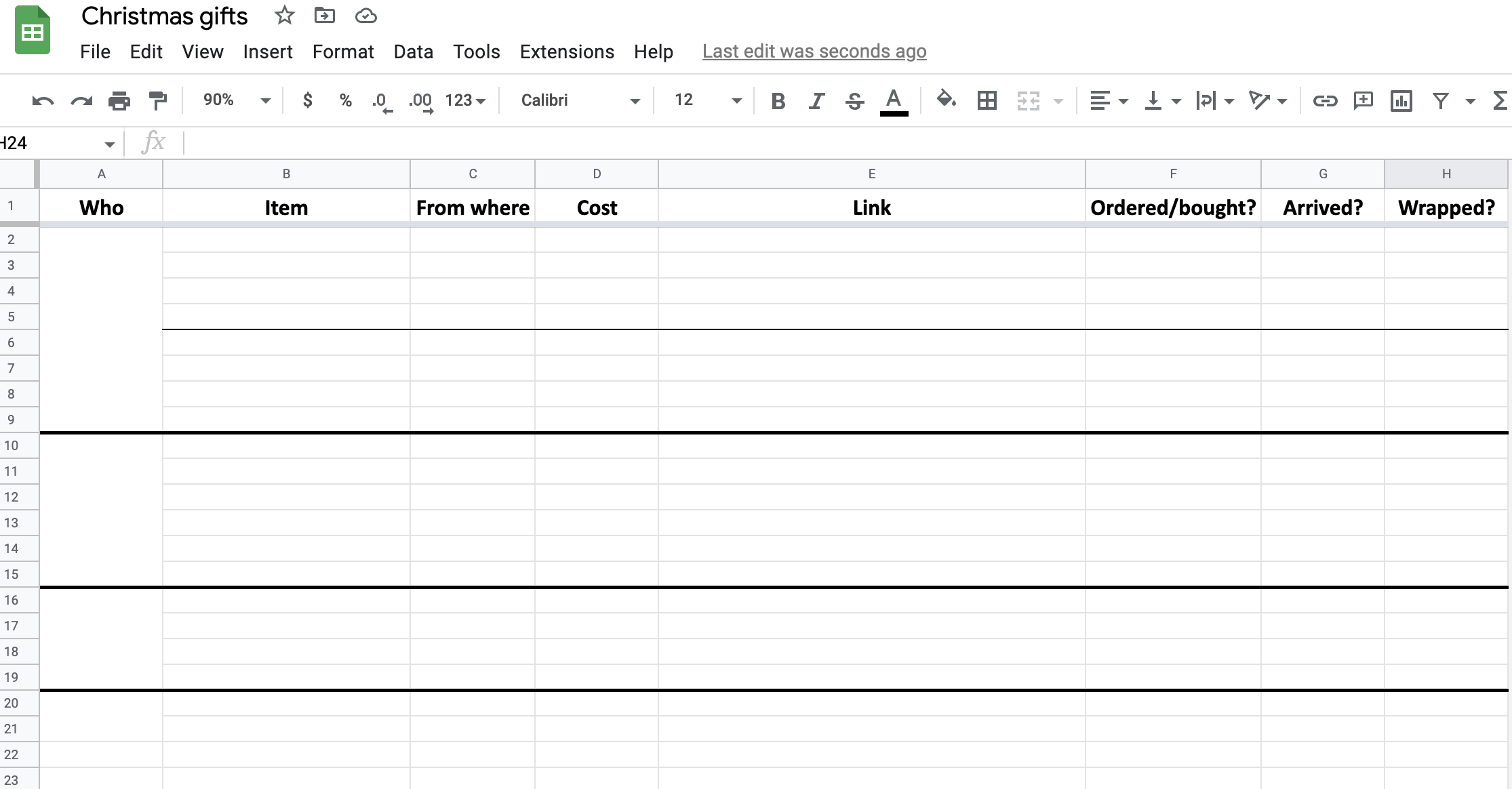 Now I can’t post an actual screenshot of the spreadsheet since it lists gifts for both Josh and my parents—he and my mom read my blog, hi!—so here’s a blank version of it: