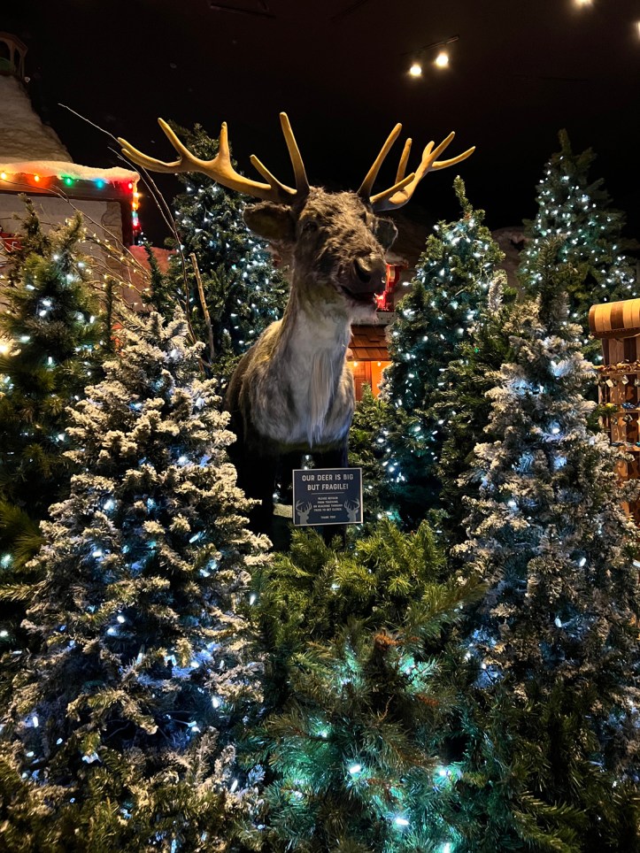 As we started walking through the part of the building that’s Christmas 24/7, I didn’t see this deer in the trees, let alone realize that it moved and made noises. Boy, did that scare me.