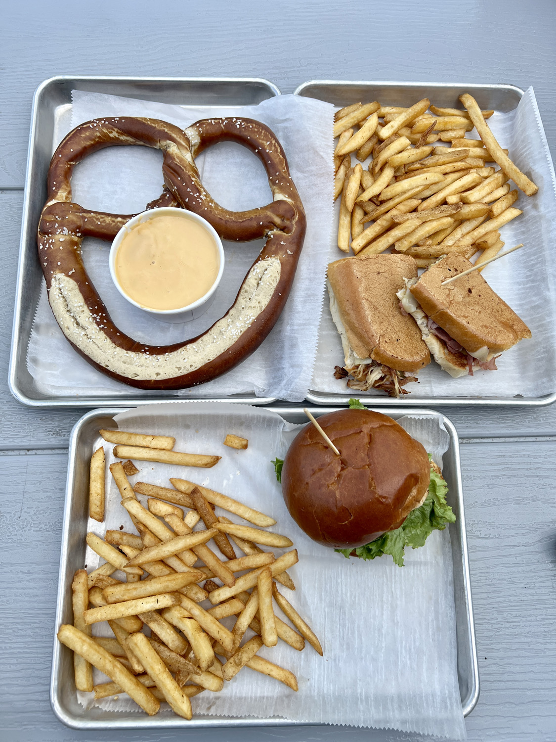 We both got flights and originally sat inside, but since it was still nice out, we moved out to the patio after we ordered our food. We got the giant pretzel to share; Josh got the Cuban sandwich and I got the grilled chicken sandwich. The beer cheese that came with the pretzel was the absolute best beer cheese I’ve ever had. Our sandwiches were really good, too.