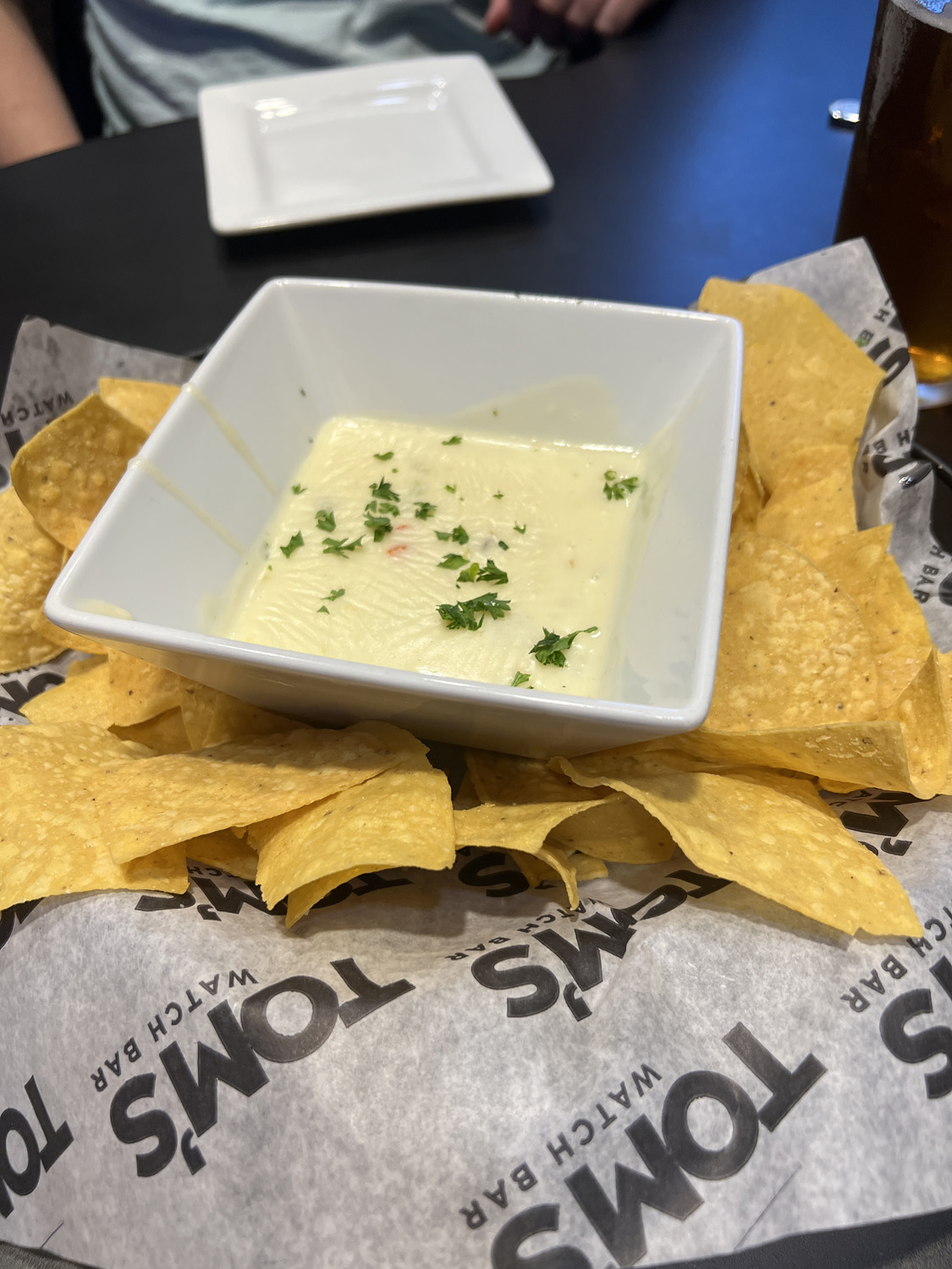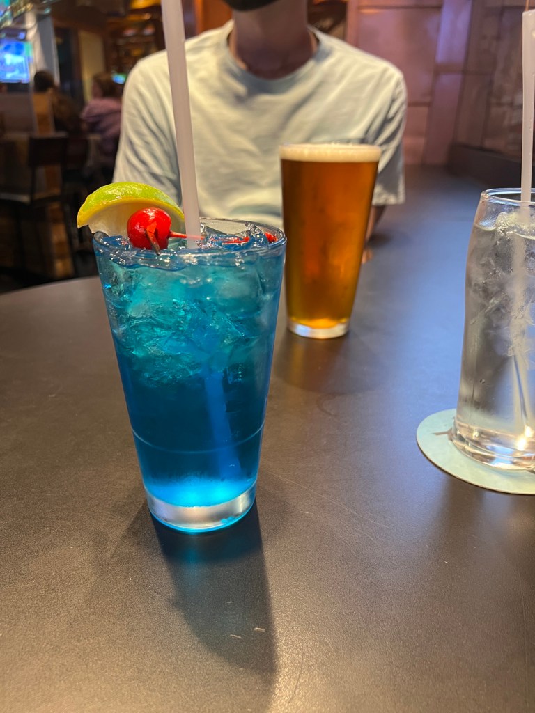 My drink was called Blue Crush—rum, Sprite, blue raspberry, and lime juice—and Josh got a Boston Lager. For an app, we got queso and chips, and for our meals, I got the California Chicken Club and Josh got the Crispy Buffalo Chicken Sandwich.