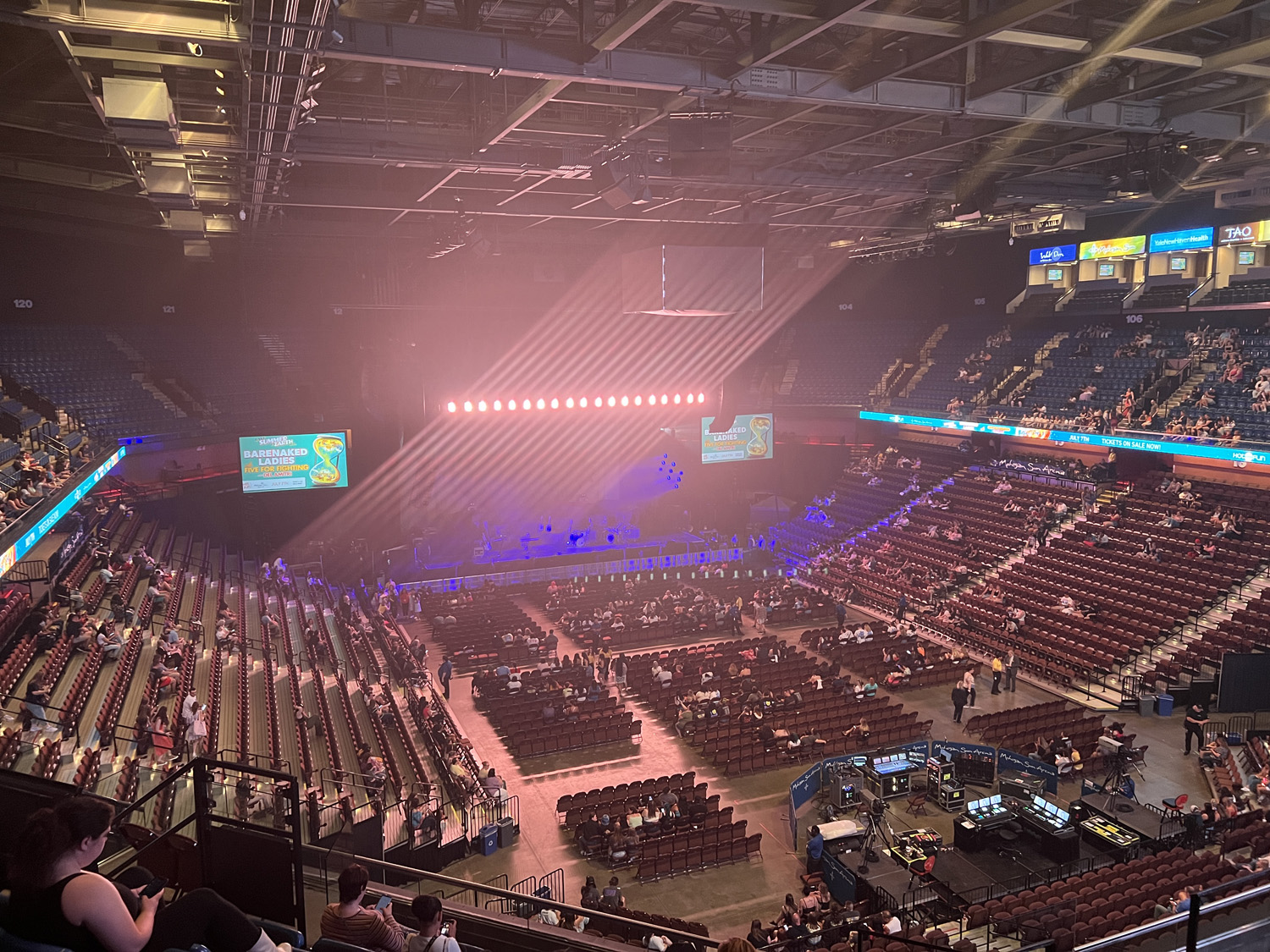 From our seats at the bar, we could actually see down to the people waiting in line to get into the arena. Doors opened at 6:00 p.m., and we were done with dinner by 6:15-ish. By the time we got to the security area, we had missed the “big time rush” so to speak. (I’ll be here all week, folks.)