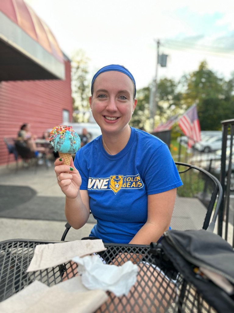 Afterward, we went to Shain’s of Maine in Sanford for ice cream—a repeat favorite from last year. I got Dino Crunch—because I’m a child—and Josh got Irish Creme & Cookies. I ended up making a mess because I got mine on a cone, and Josh had to go get extra napkins.