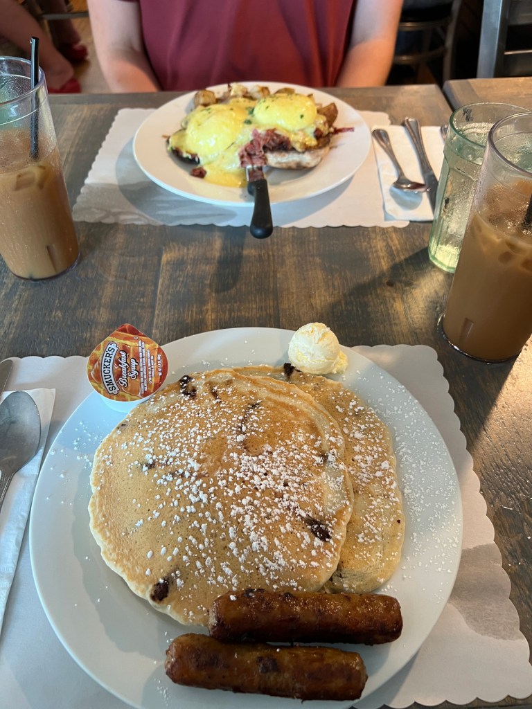 I got two chocolate chip pancakes and sausages, and Josh got Eggs Benedict Irish with corned beef hash. Both of our meals were really good. I couldn’t finish the last quarter of my pancakes, so Josh did.