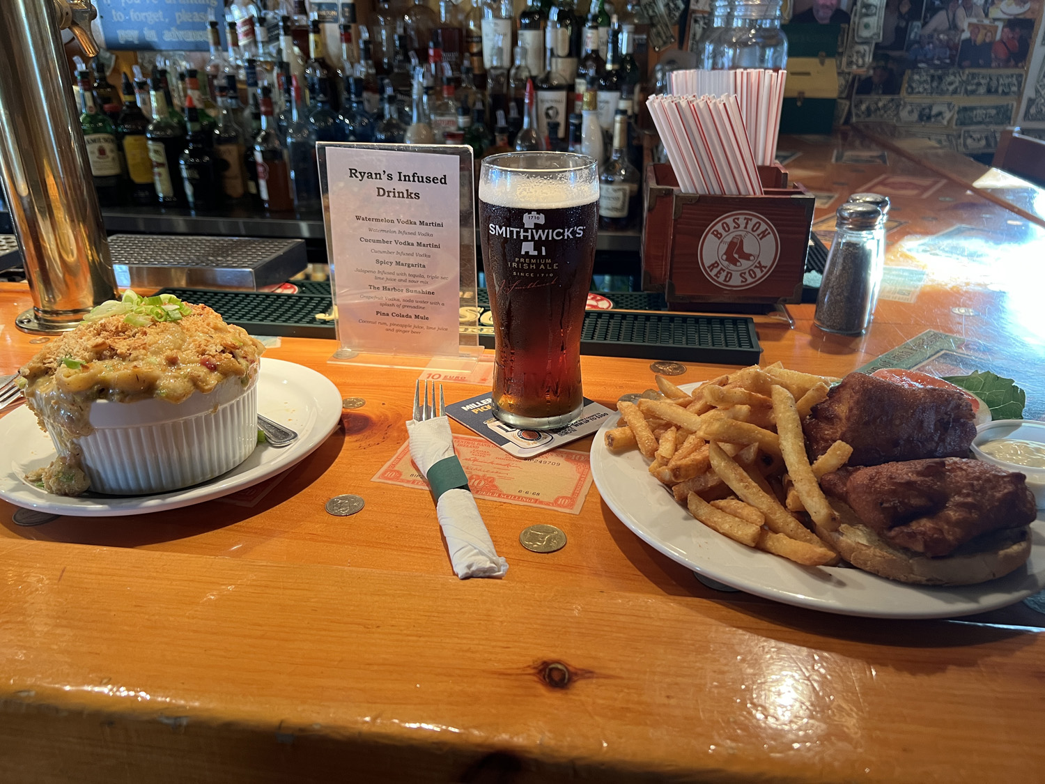 For beers, we both got Smithwick’s; for dinner, I got a haddock sandwich and Josh got a blackened chicken mac and cheese.