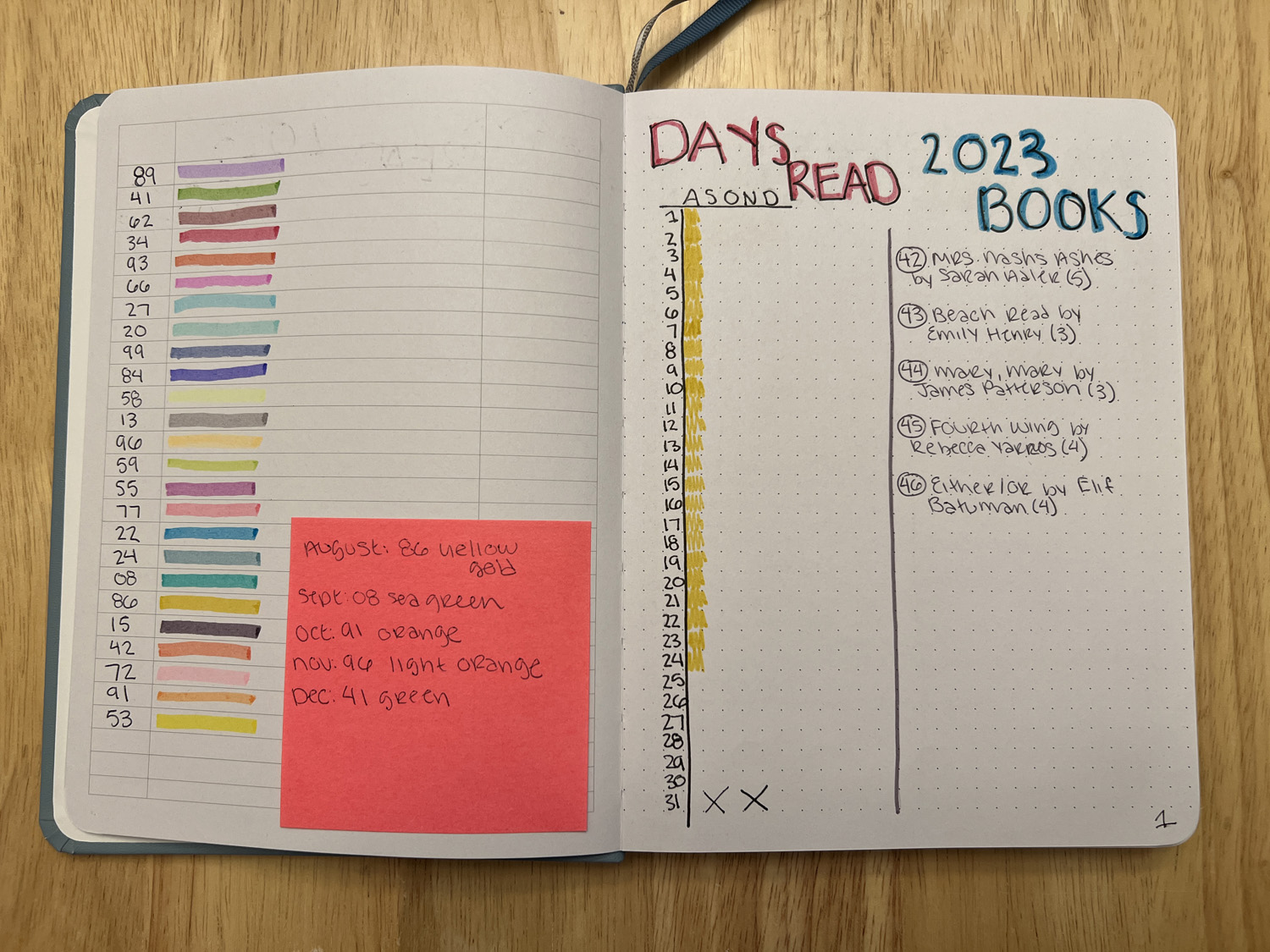 I mark of every day that I’ve read, and for the 2023 Books list, I write the number book it is of the year, the name and author, and my star rating in parentheses.