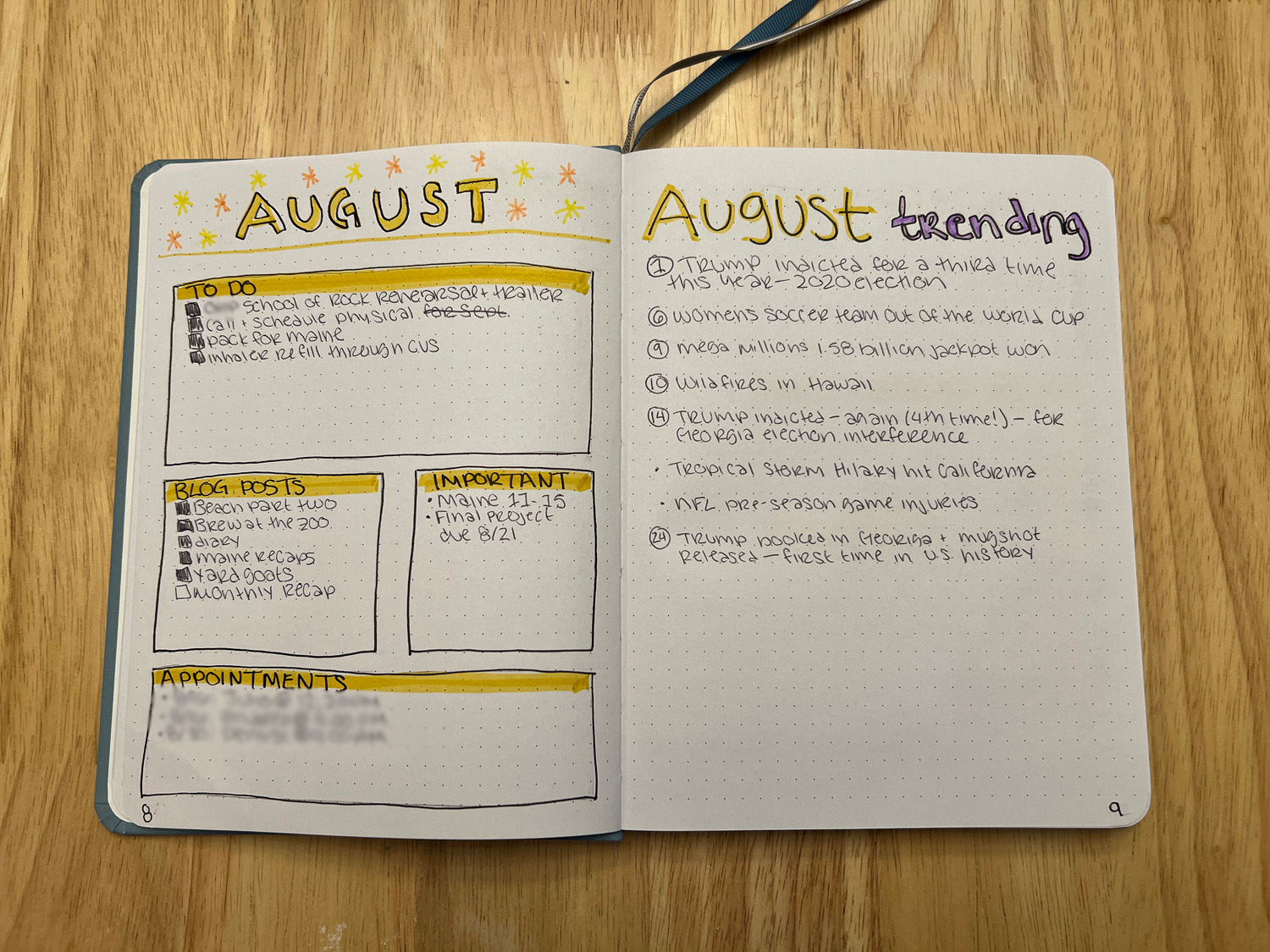 This monthly spread is the same one I’ve used before; it helps me see these things at a glance, especially the running to do list and my upcoming appointments. The trending page is new. I wanted a way to keep track of things that were popular/talked out in the media or in my life. It’ll be interesting to look back at these pages at the end of the year and remember all of the things that happened in 2023.