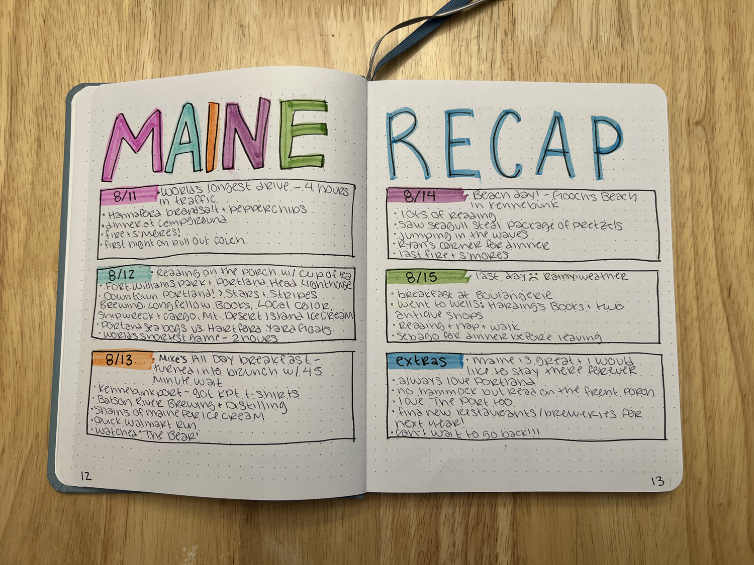 Here’s an example of something I drew for my Maine Recap. I like the ability to draw boxes with the use of the dots, and so far the markers don’t really bleed through the pages, so I’m able to do some fun lettering.