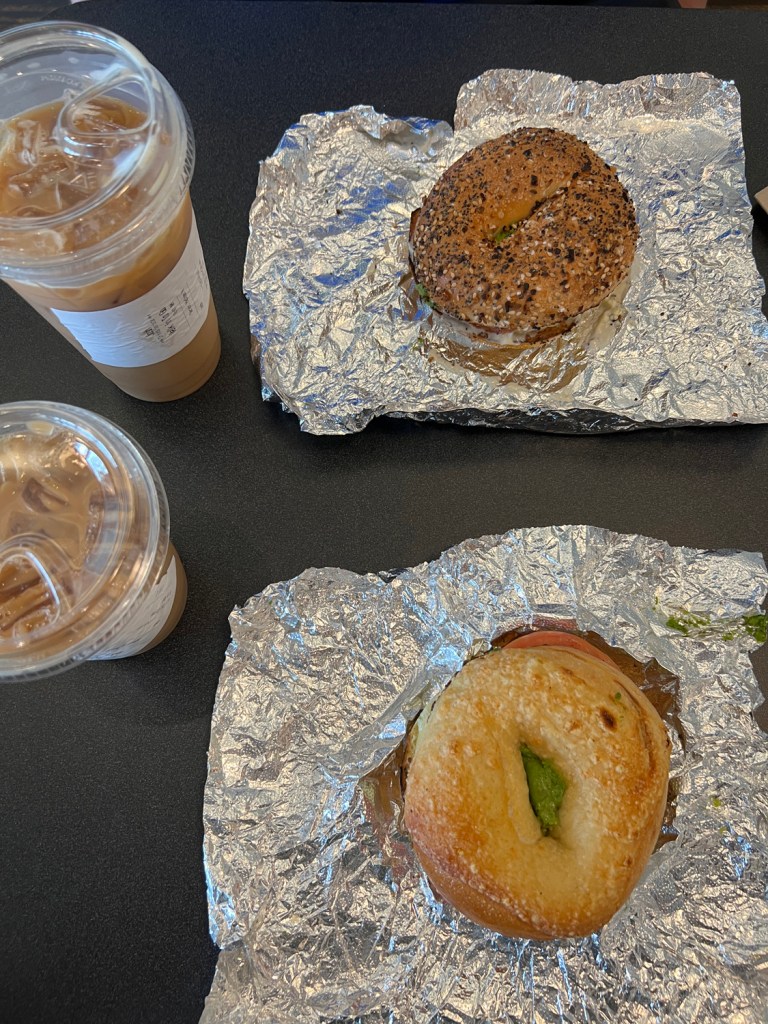 I got an iced coffee and a fresh bagel sandwich: egg, pepper jack, avocado, tomato, and red onion on an asiago bagel. Josh got a cold brew and a blue cheese and bacon bagel sandwich: egg, bacon, blue cheese, avocado, and garlic aioli on an everything bagel.
