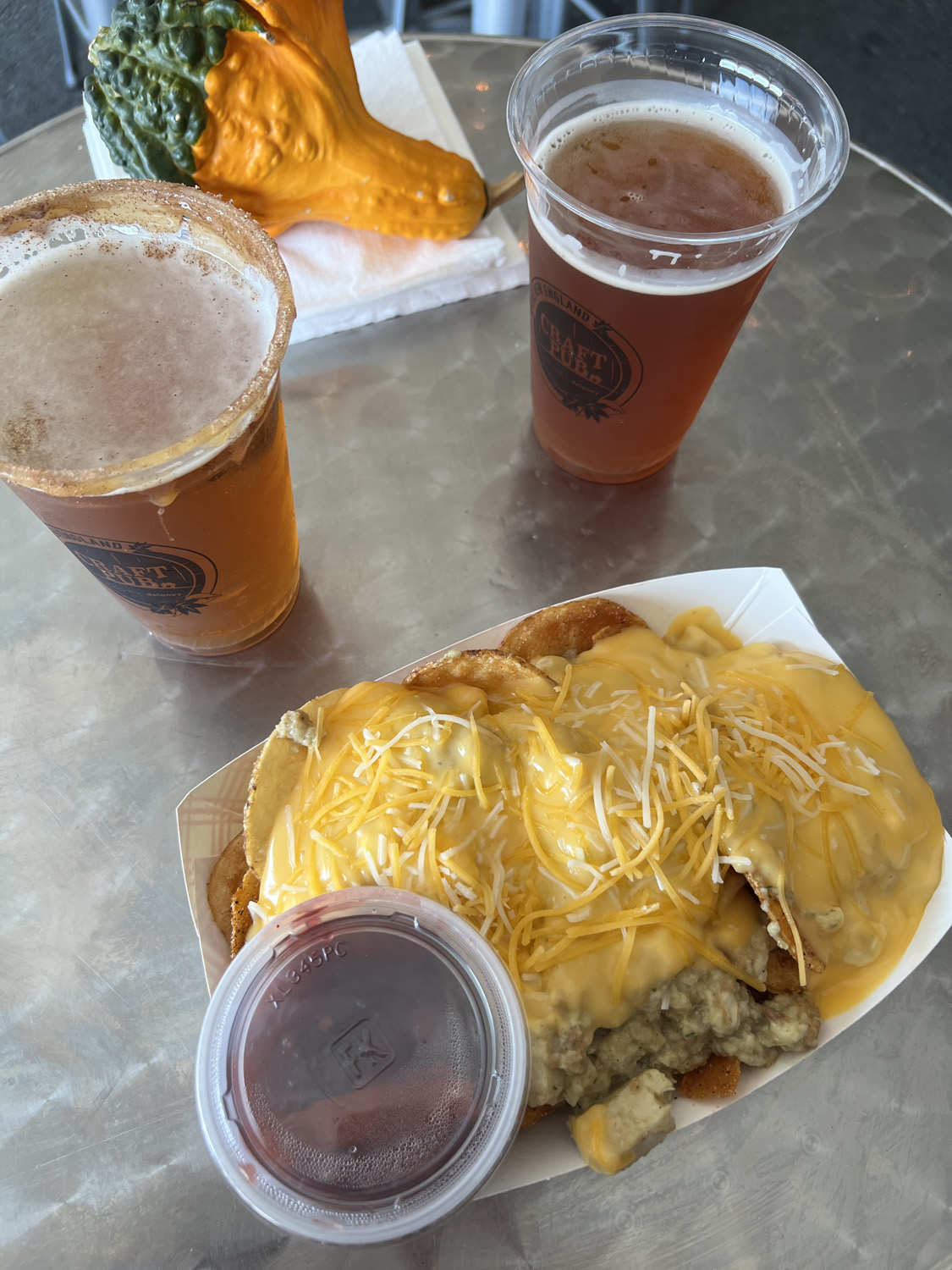 This is one of the things I was looking forward to the most: pumpkin beer and Thanksgiving nachos from the New England Craft Beer Pub. The nachos are new to the fair this year, and they were on our must-do food list. They’re made with fried chips, stuffing, chunks of turkey, cheese, and cranberry sauce for dipping.