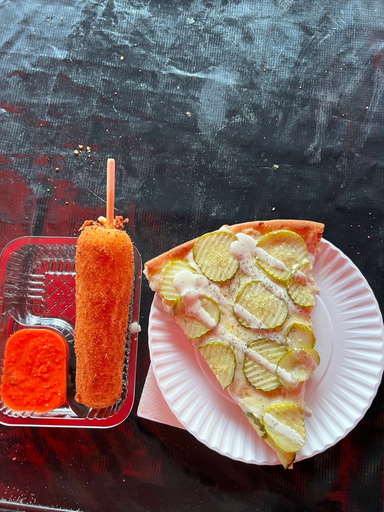 We were ready for more food, so we walked back across the grounds to Angela’s Pizza for a slice of dill pickle pizza and a giant mozzarella stick. This was the only time we had to wait in line; it took about 15 minutes but the line moved pretty quickly.