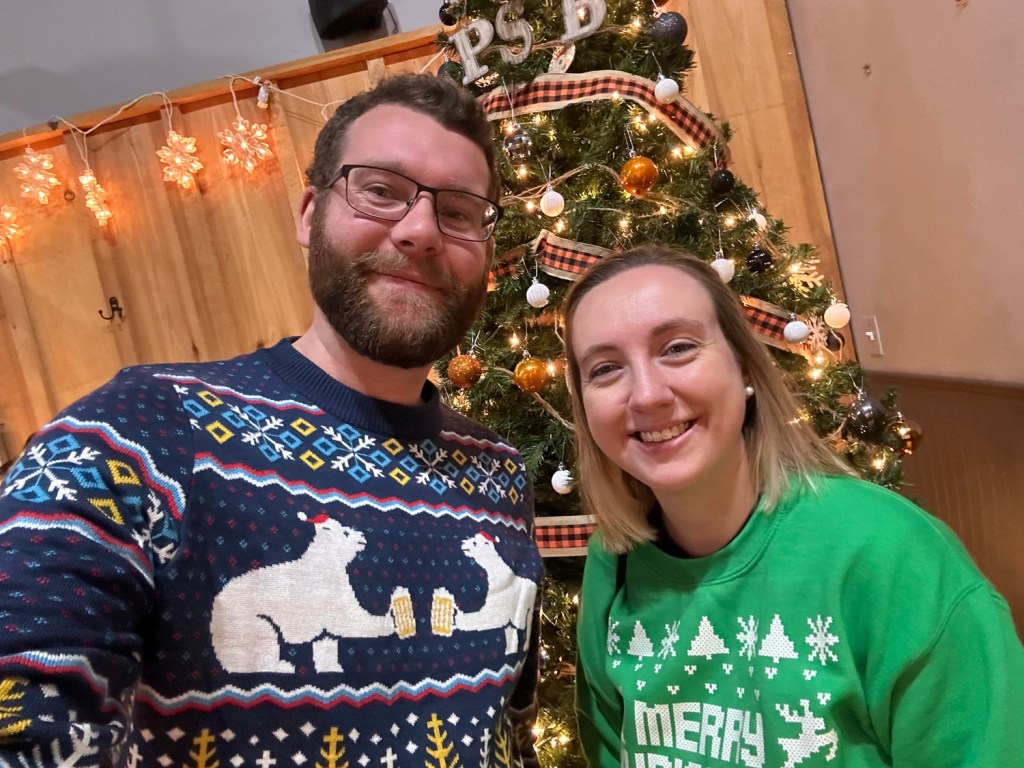 We went to an ugly sweater party at a local brewery. It was just the two of us, but it was fun to have a little date night together. We each got flights and another beer after that; I really liked their s’mores milkshake-style beer. (For those wondering: my sweatshirt says “Merry Christmas Ya Filthy Animal” from Home Alone 2.)