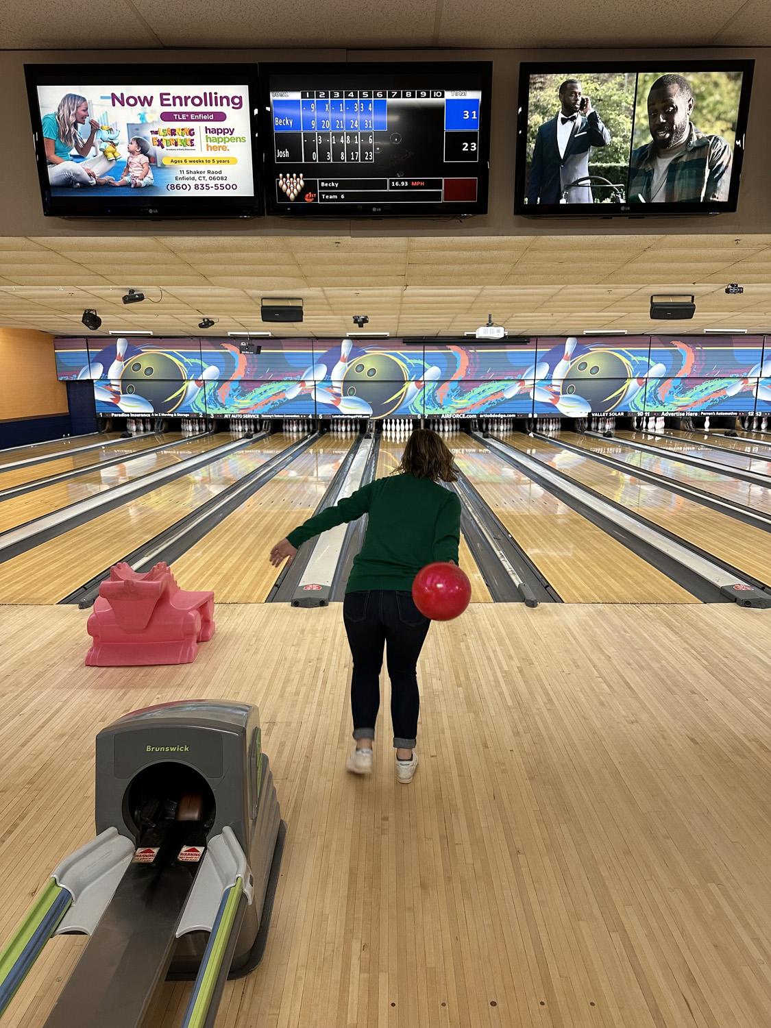Our first stop was bowling—we hadn’t been in over a year, and I figured the bowling alley wouldn’t be busy on a Friday afternoon. I’m surprised Josh agreed to it since he claims I “hustled” him the last time we went. It’s not my fault I’m the cool kid who rolls in with her own bowling ball and shoes and can get an occasional strike.