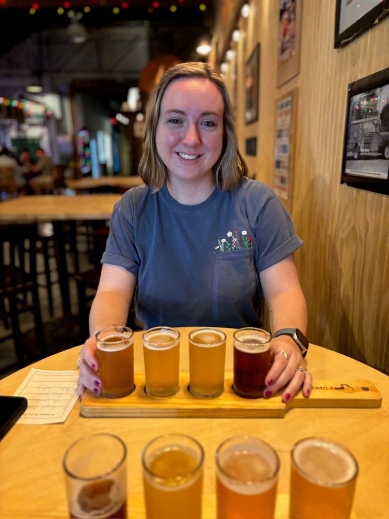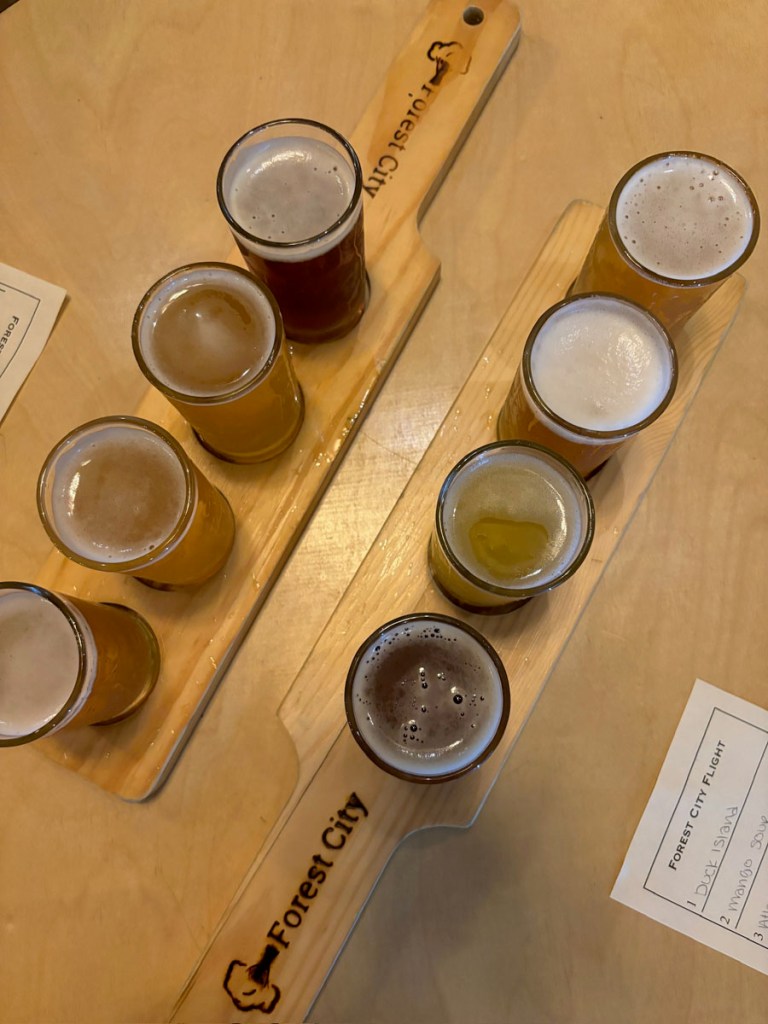Forest City Brewery. We walked to Forest City after lunch to get some flights. The brewery wasn’t super busy on an early Sunday afternoon, and the girl behind the bar who waited on us was super nice. It was raining on and off that day, so we chose to sit inside; there was a big patio area outside where we would have sat if the weather was nicer.