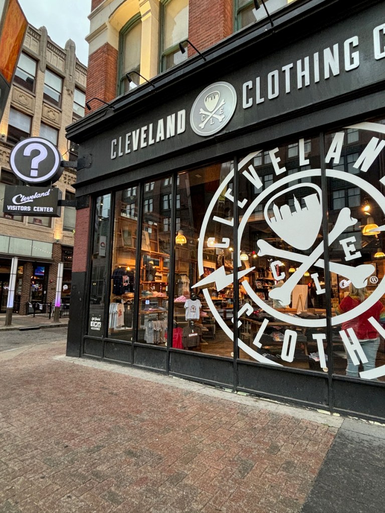Cleveland Clothing Company. It was a bit tricky to find a Cleveland “gift shop” in the city—it was a lot easier last year when we were in DC—but I found the Cleveland Clothing Company which is locally owned and had a good variety of swag. I got a t-shirt, glass, and bookmark for myself, and I got my dad a Cleveland beer koozie and my mom a Cleveland magnet. Josh got a sweatshirt for himself.