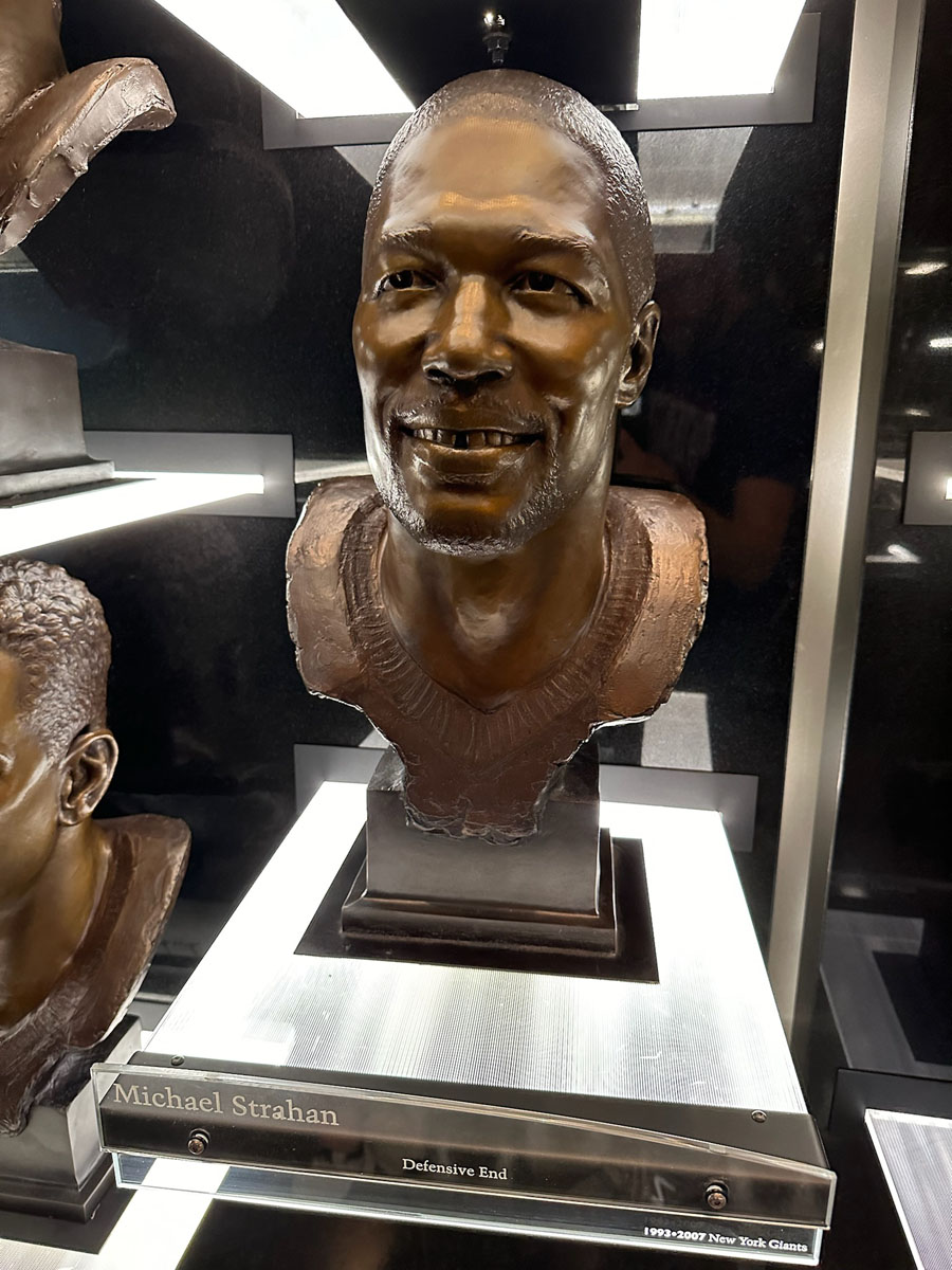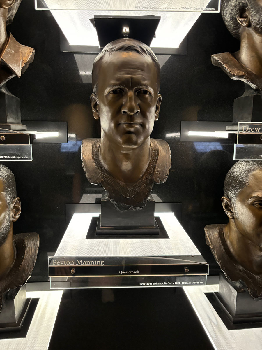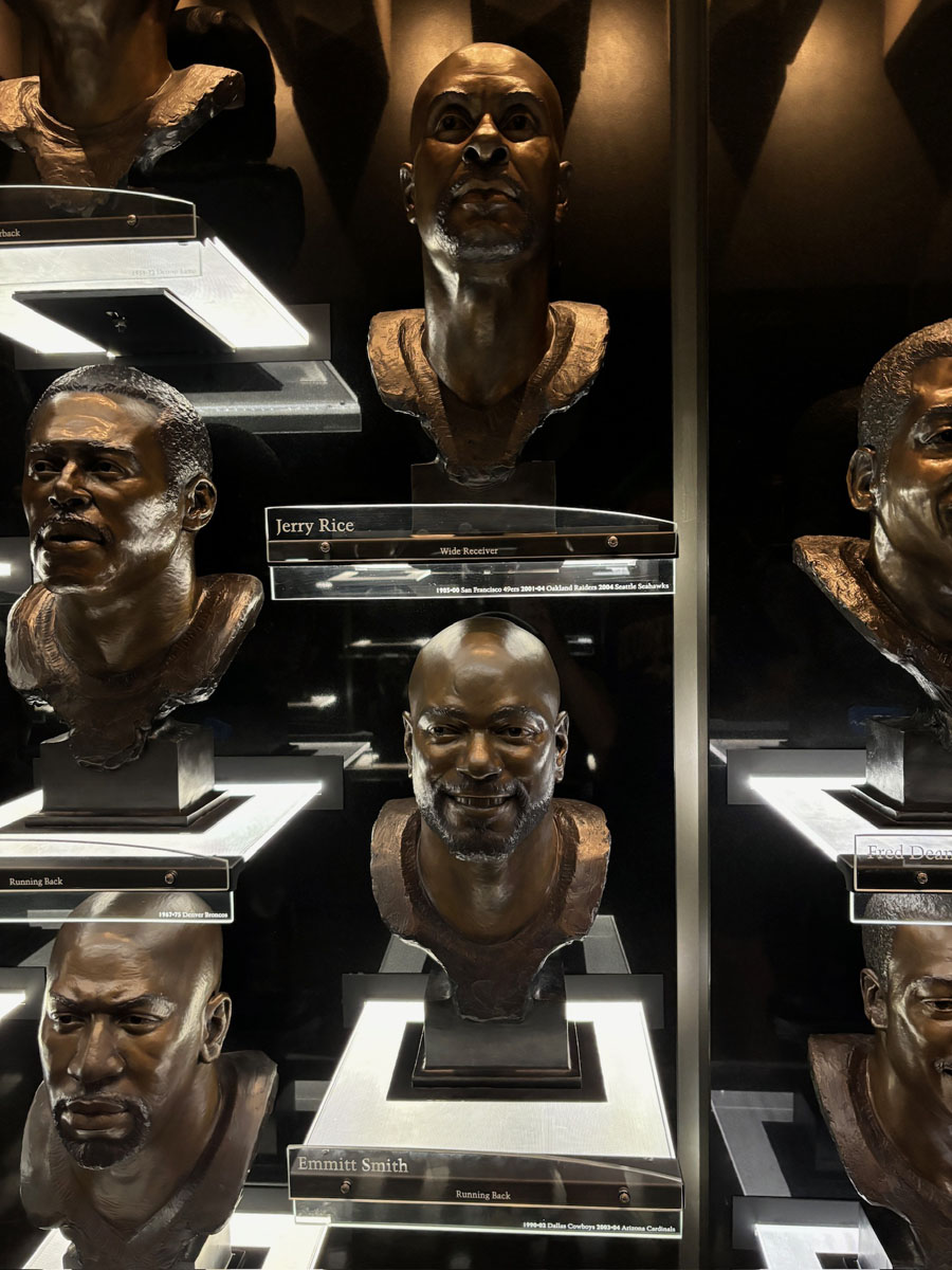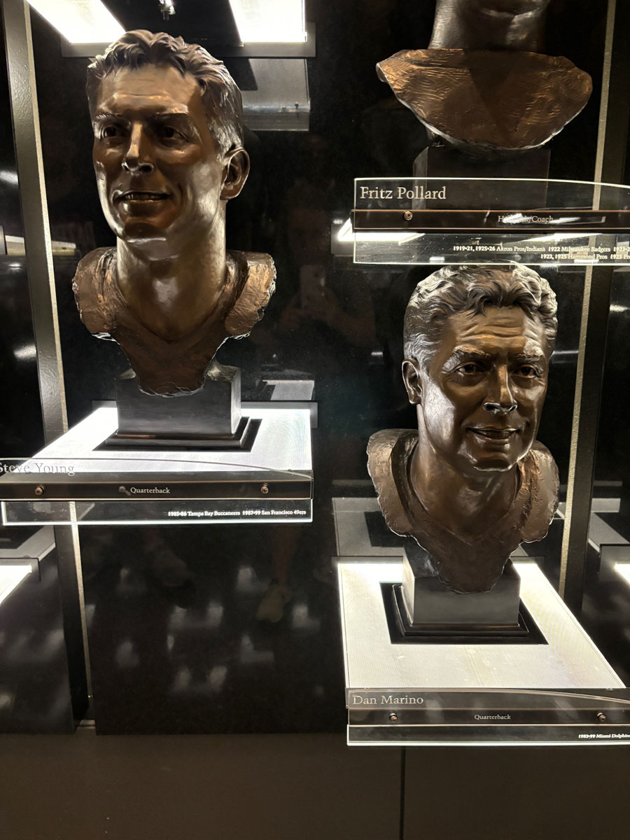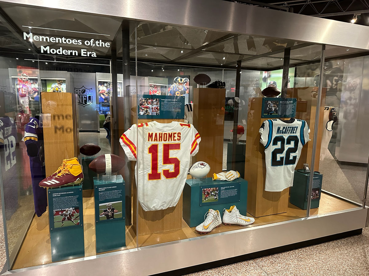 We started in the Hall of Fame lockers area, highlighting the incoming class of 2024, then moved onto The NFL’s First Century Gallery, which is actually on two levels. Then came the Hall of Fame gallery that has all of the bronze busts. We saw the Lombardi Trophy and Super Bowl Championship Rings on display as well as pieces from the recent seasons in the Pro Football Today Gallery—boy am I glad Andy Reid’s face shield made it to the HOF.