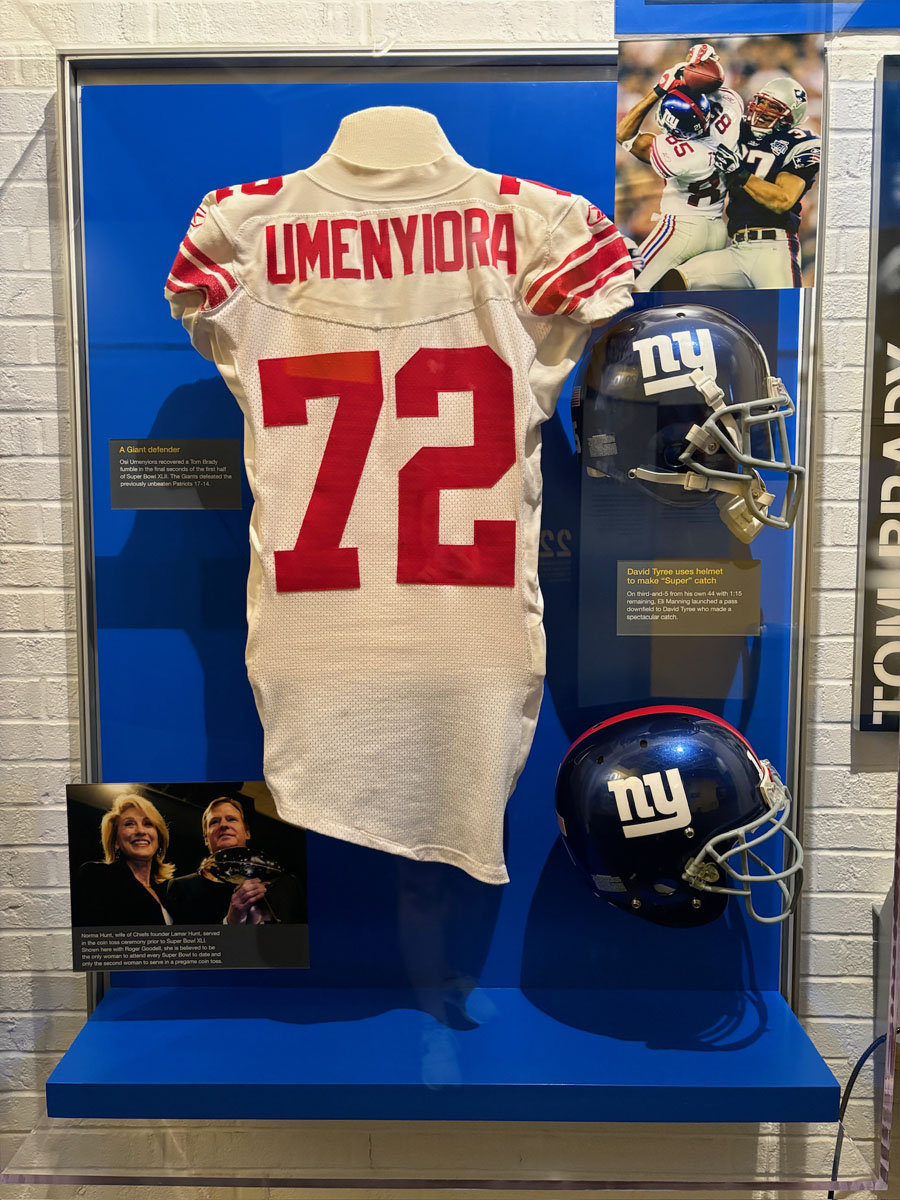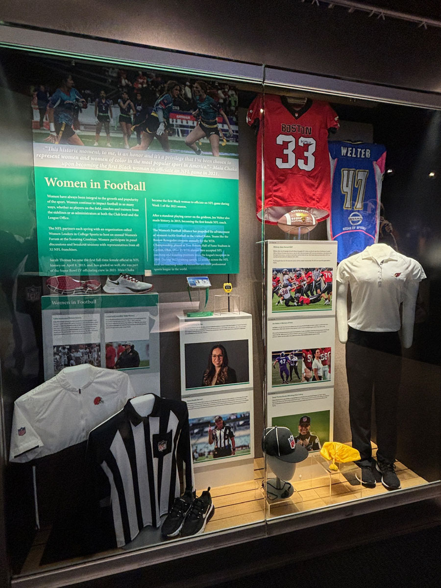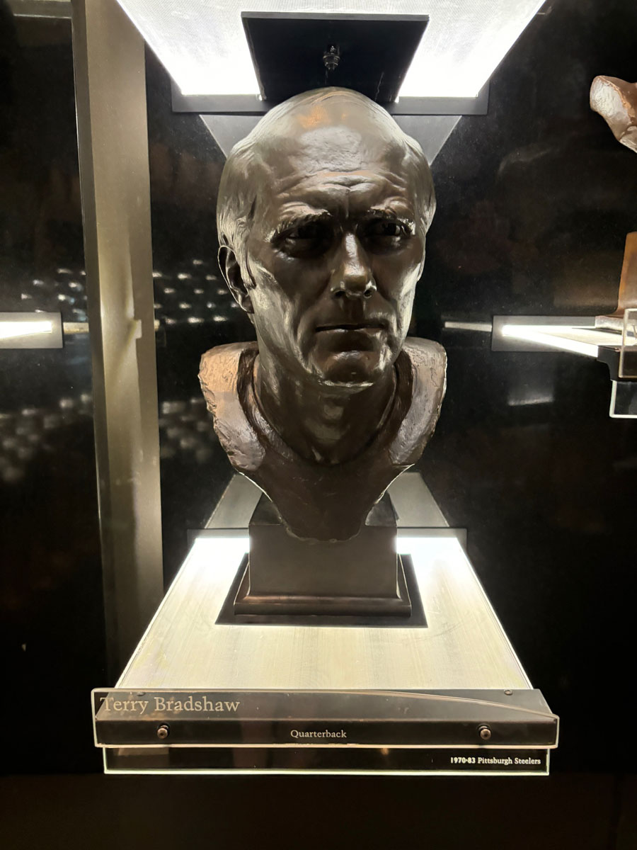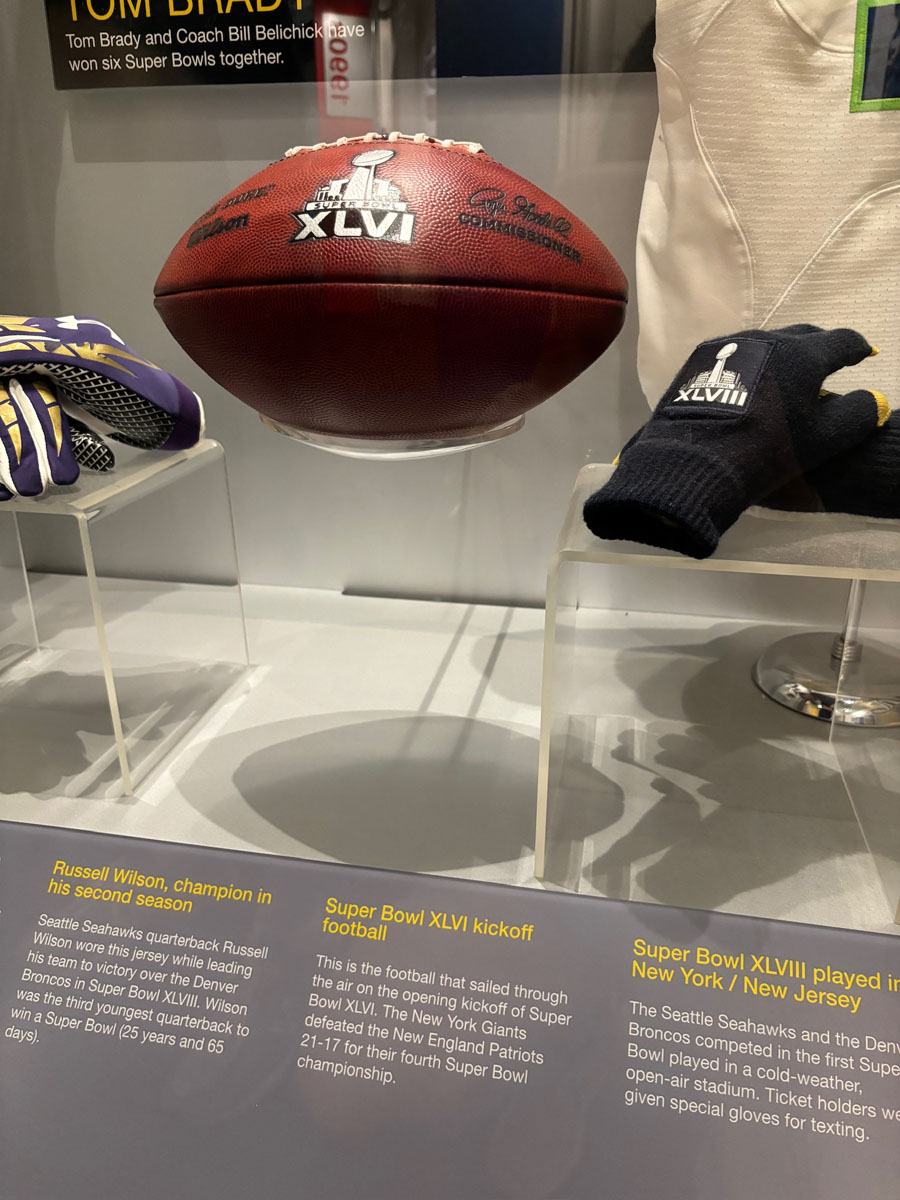 We started in the Hall of Fame lockers area, highlighting the incoming class of 2024, then moved onto The NFL’s First Century Gallery, which is actually on two levels. Then came the Hall of Fame gallery that has all of the bronze busts. We saw the Lombardi Trophy and Super Bowl Championship Rings on display as well as pieces from the recent seasons in the Pro Football Today Gallery—boy am I glad Andy Reid’s face shield made it to the HOF.