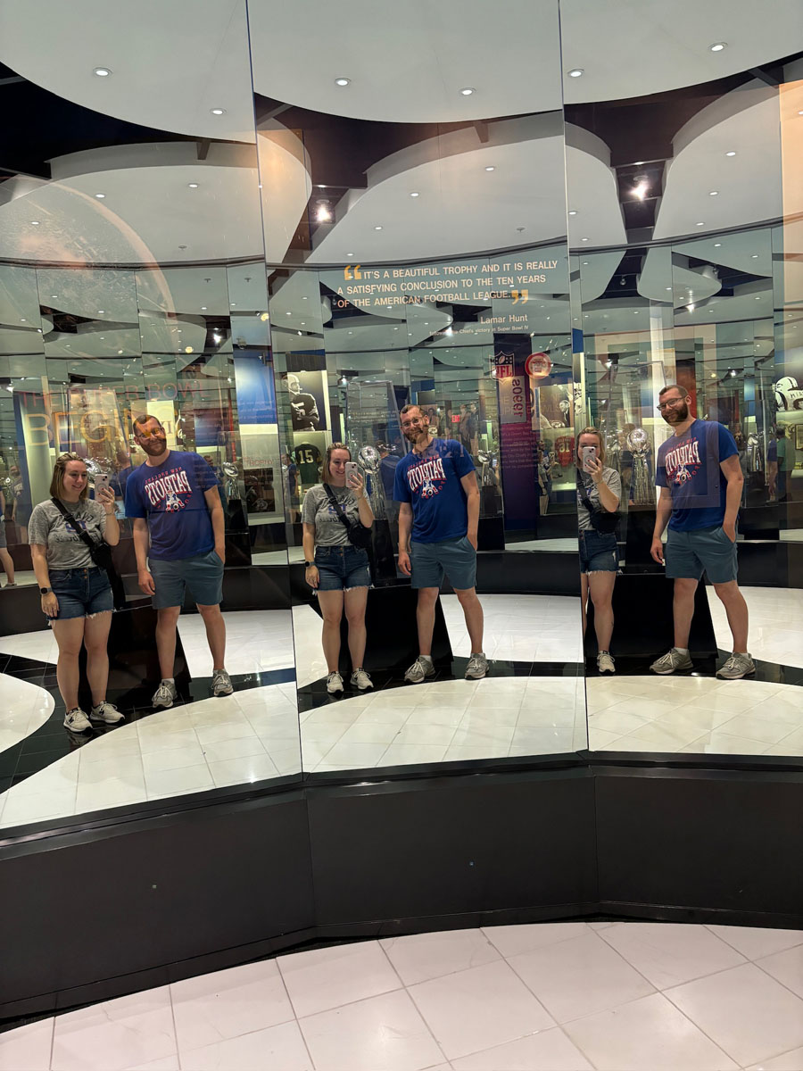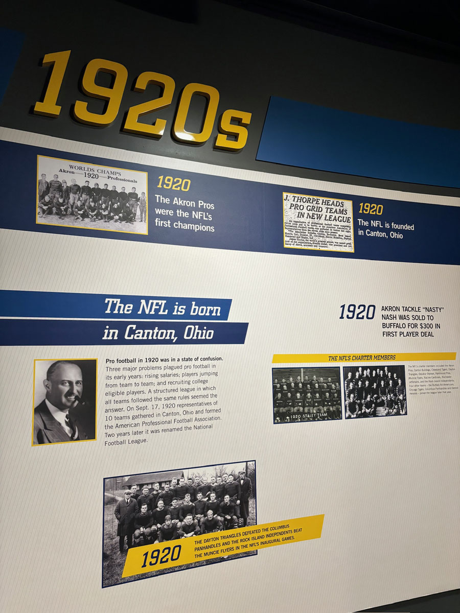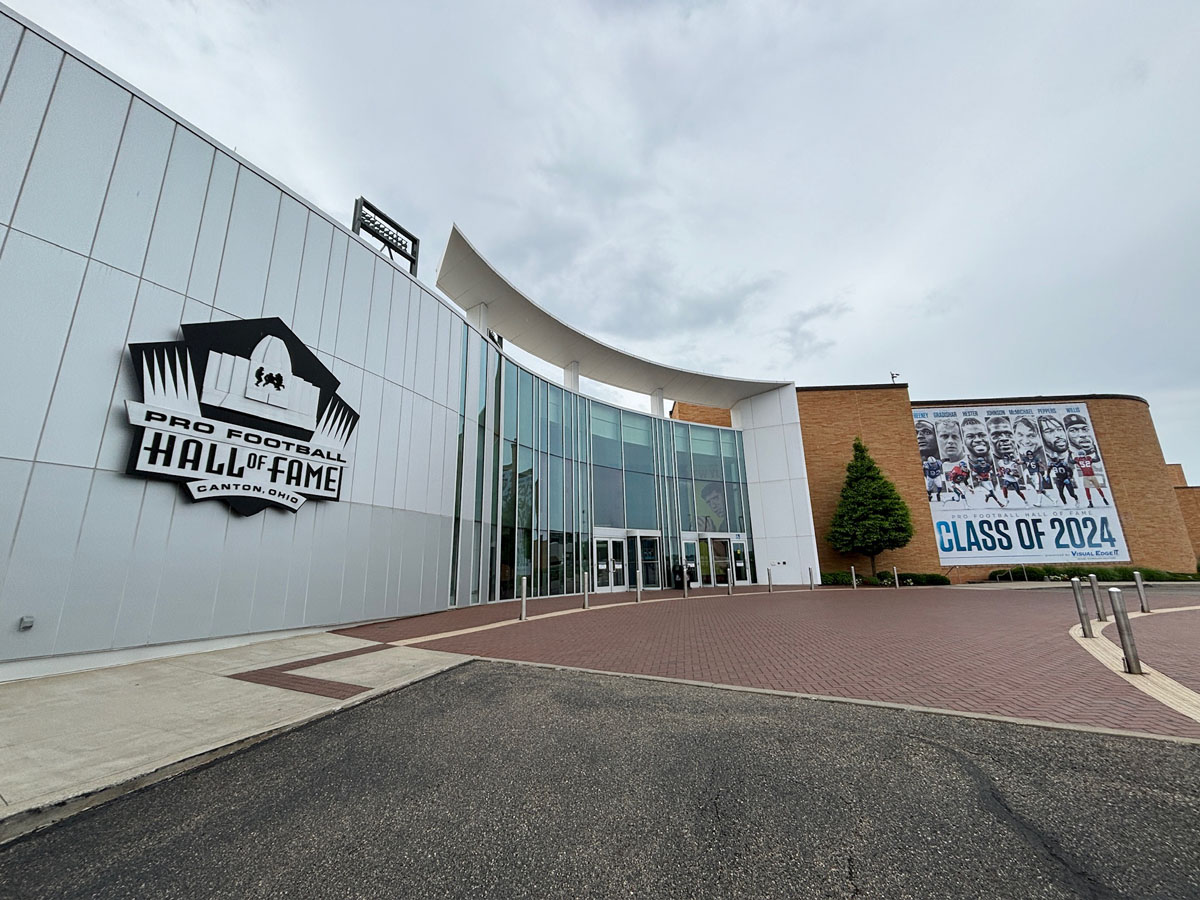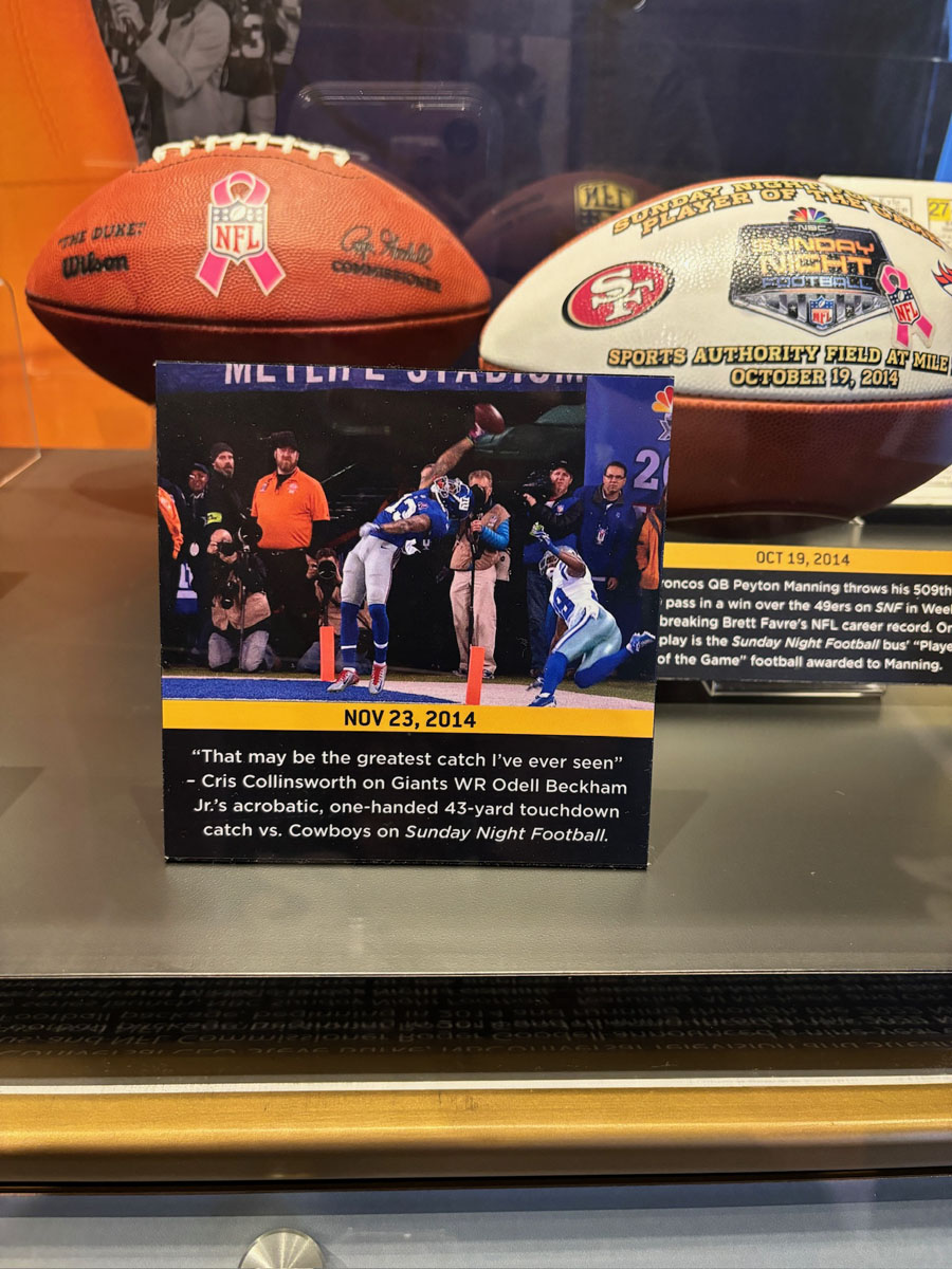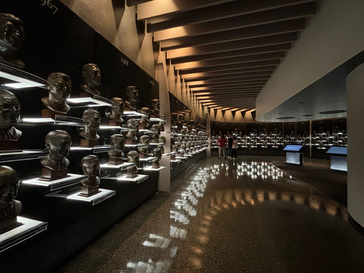 We started in the Hall of Fame lockers area, highlighting the incoming class of 2024, then moved onto The NFL’s First Century Gallery, which is actually on two levels. Then came the Hall of Fame gallery that has all of the bronze busts. We saw the Lombardi Trophy and Super Bowl Championship Rings on display as well as pieces from the recent seasons in the Pro Football Today Gallery—boy am I glad Andy Reid’s face shield made it to the HOF.