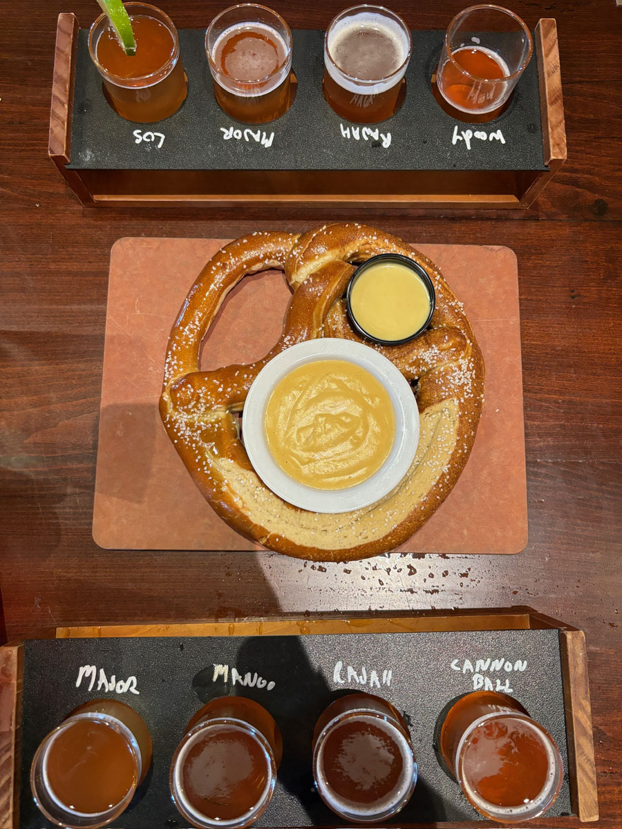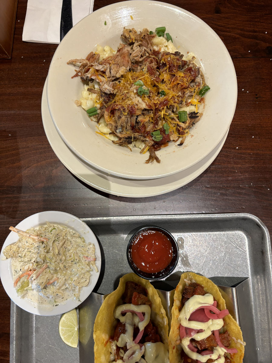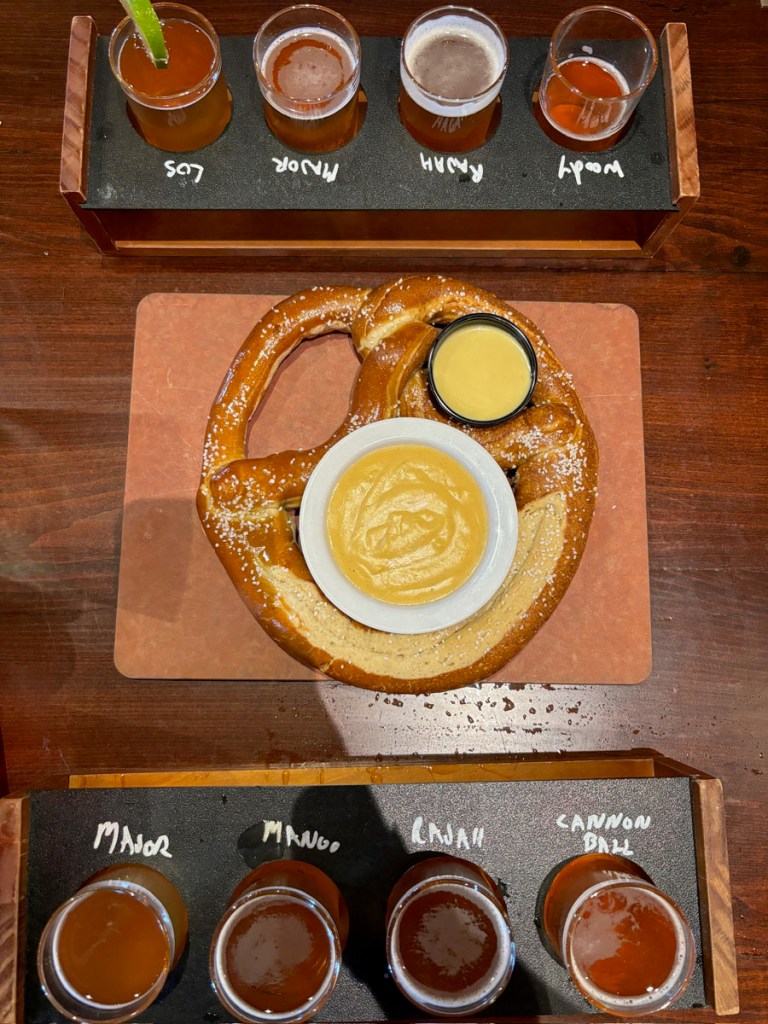 Dinner: The Brew Kettle. The Brew Kettle is right next to the HOF, so it was just a short walk and a good option for us to grab food before heading back to Cleveland. You know the deal by now: flights of beer and splitting a giant pretzel. Josh got BBQ Mac and Cheese and I got burnt end tacos; literally the only thing I didn’t like the entire we were there was the side of coleslaw. I’m oddly picky about my slaw and something just tasted off.