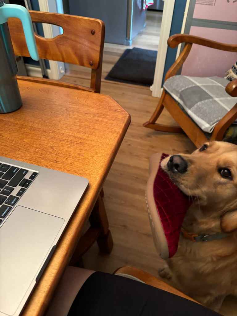 I worked from home on location from my parents’ house for a few hours last week, and I had a new co-worker who kept bringing me every shoe she could find in the house. Not super helpful in completing my work tasks, but she’s so cute.